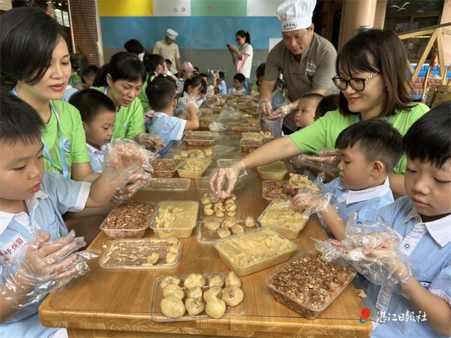 在活動中,市三幼的孩子們踴躍學習湛江非遺海味雞仔餅的制作工藝。