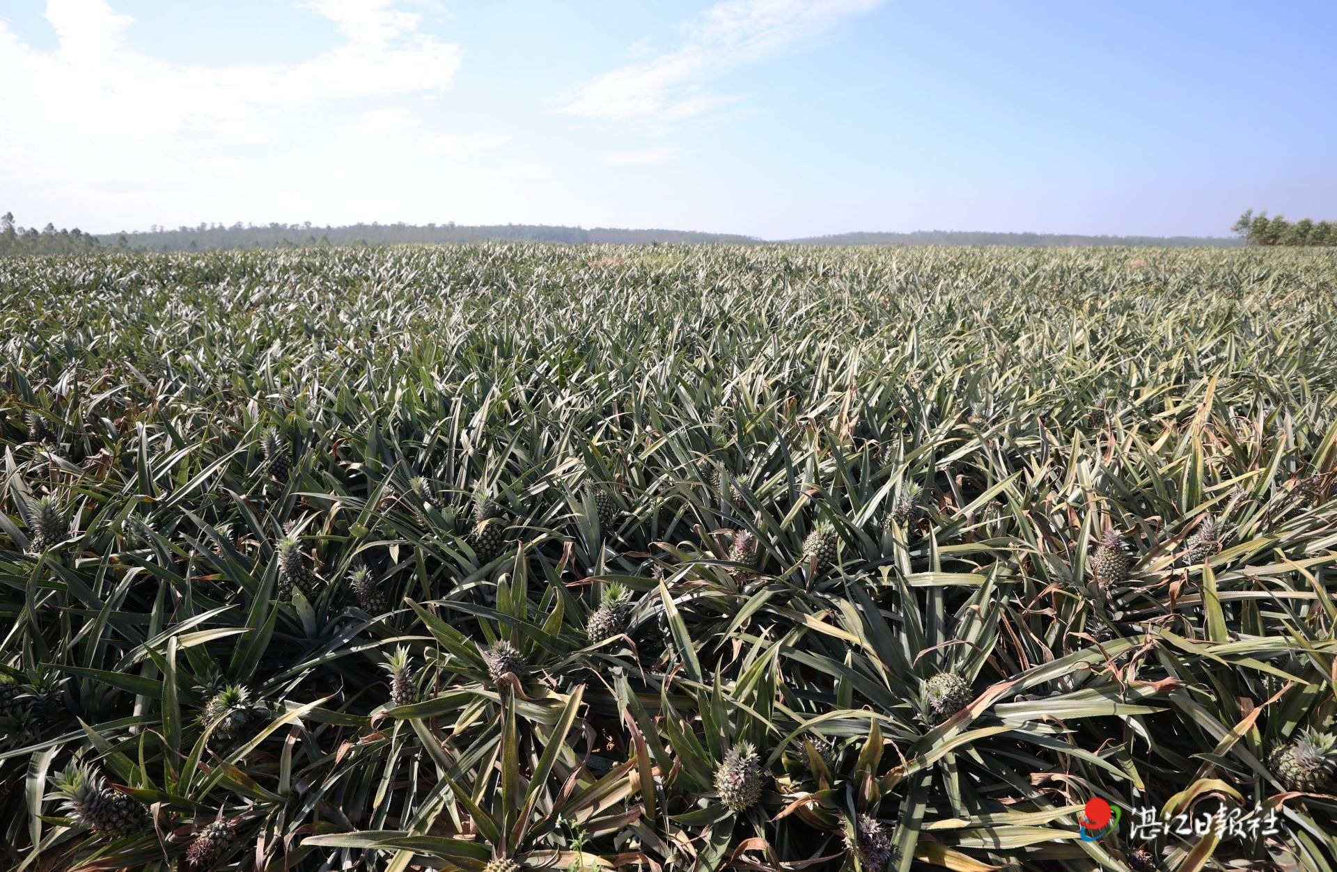 沿著高低起伏、蜿蜒有致的公路,記者來到松柏村的一片高地上。放眼望去,具有南歐風(fēng)情的“菠蘿的海”景色呈現(xiàn)在眼前,一望無際的菠蘿在紅色土地上如鋪上綠色的地毯。