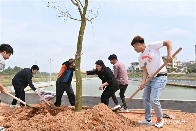 由廣州駐覃巴駐鎮幫鎮扶村工作隊、覃巴鎮黨員干部、沙田村兩委干部、羅村村民群眾和羅村小學師生代表100多人參加了此次以“黨建引領綠美鄉村,廣湛同心共促振興”為主題通車植綠活動。他們揮鍬鏟土、扶樹定根、提水灌溉,種植下自發籌措來的500多株樹苗,包括50多株白銀樹、300多株桃樹、100多株黃花風鈴木。