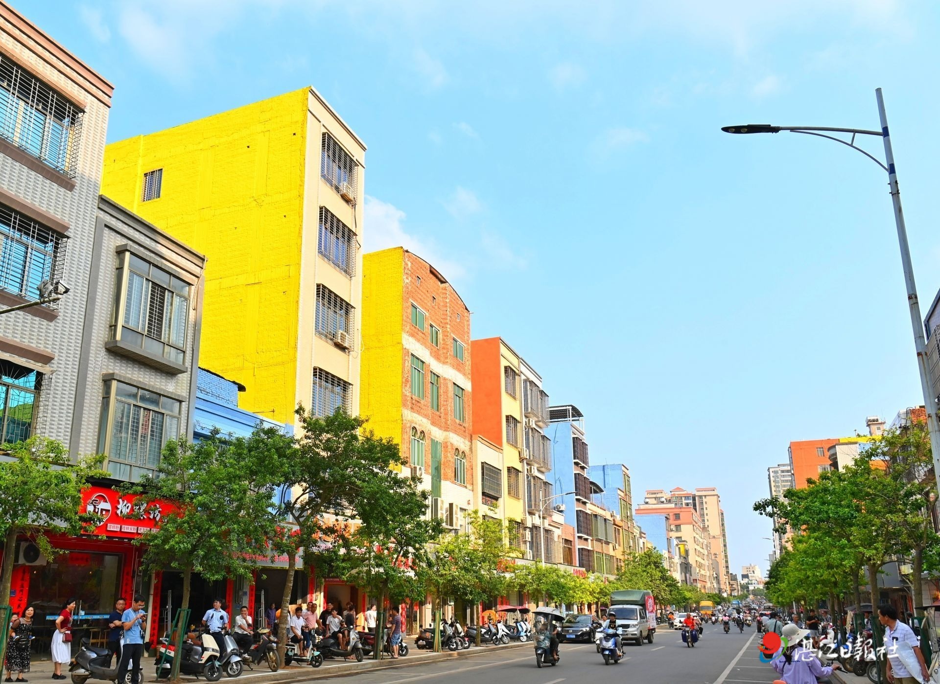 雷州市新華中路,道路兩旁樓房的外立面色彩鮮明、別具特色。