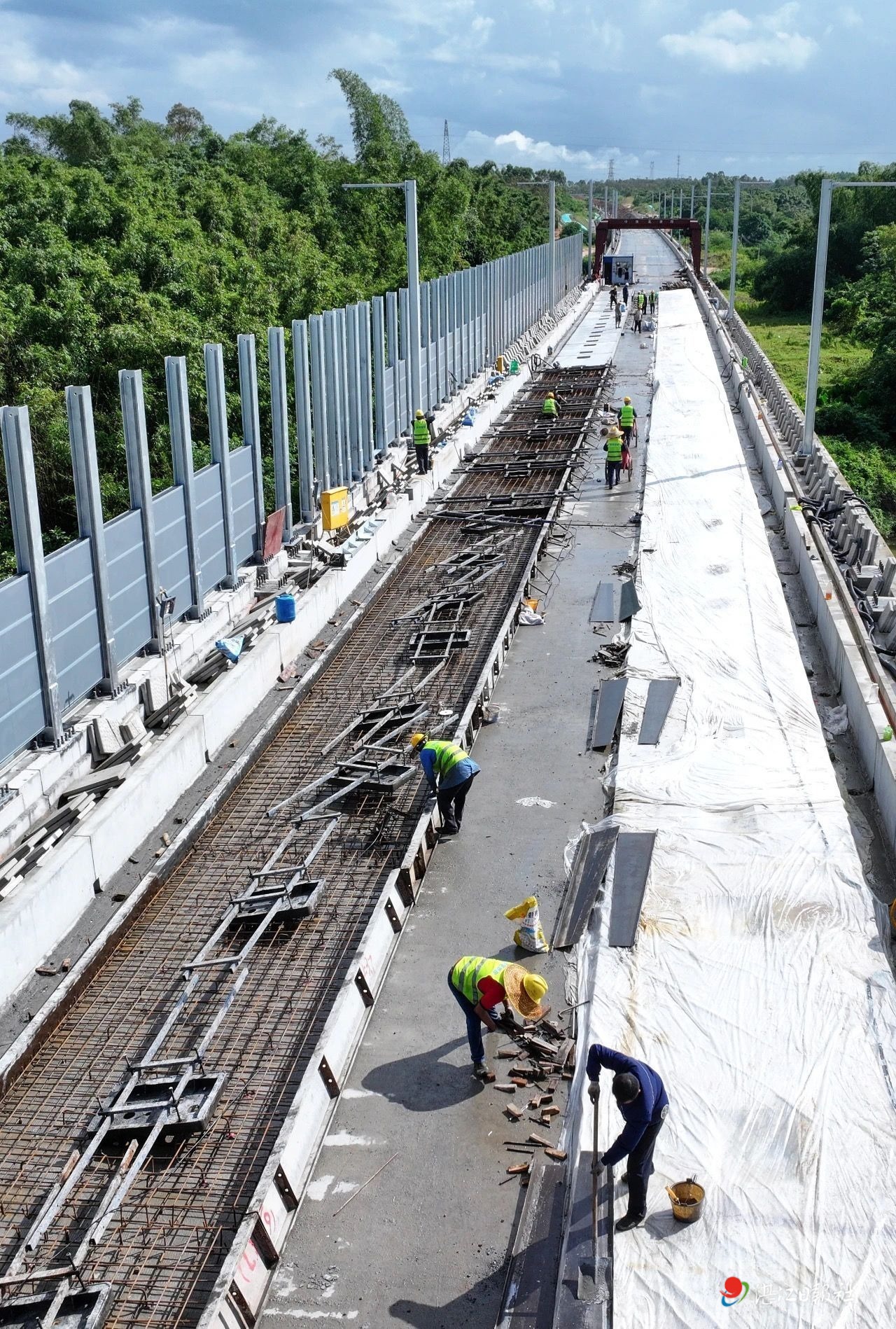 在現場,漠陽江特大橋左幅部分橋面已完成底座板施工,正按照“一布一膜一管”的要求進行養護,即覆蓋一層土工布后,再鋪上一層塑料薄膜,并安裝一根扎了小孔作灑水用的水管。