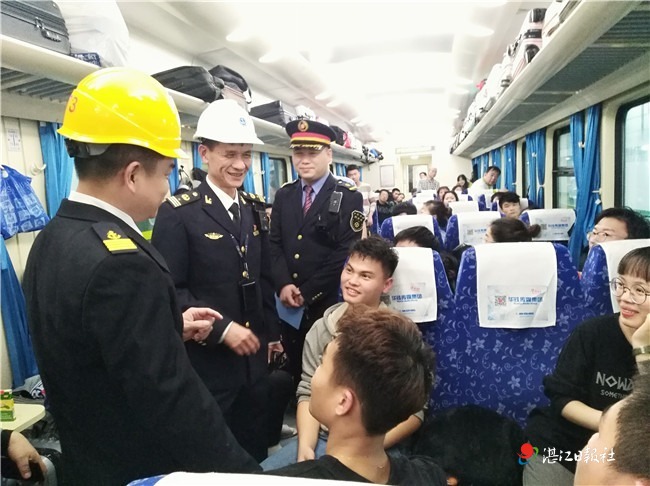 春節(jié)期間麥貳(左二)向火車輪渡旅客送祝福。 湛江海事局供圖