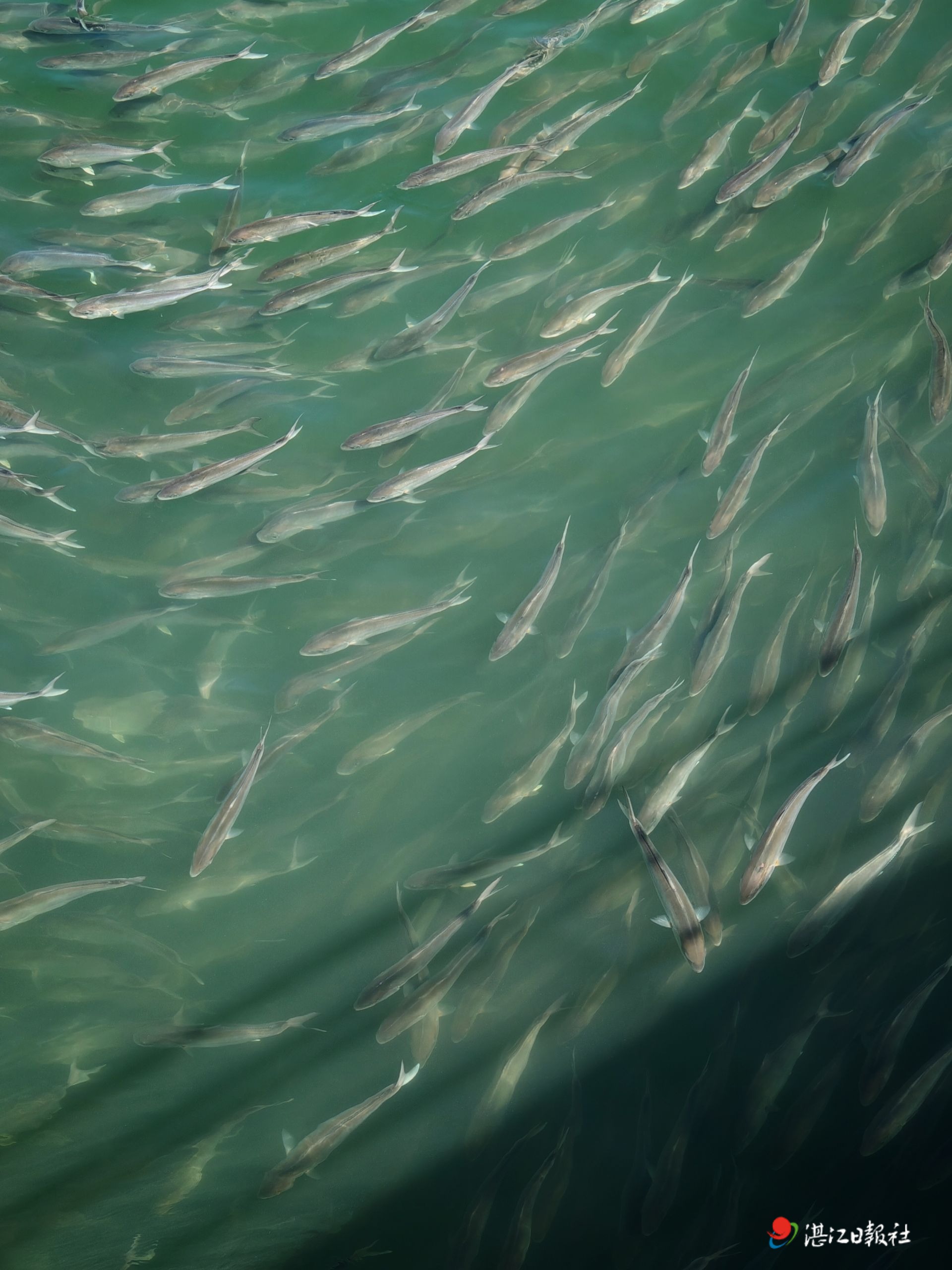 隨著工作人員按下開關,飼料自動投喂系統每隔一段時間就自動啟動,儲存在飼料倉的飼料通過管道運輸,從播撒器噴灑而出,金鯧魚紛紛游到水面上搶食。