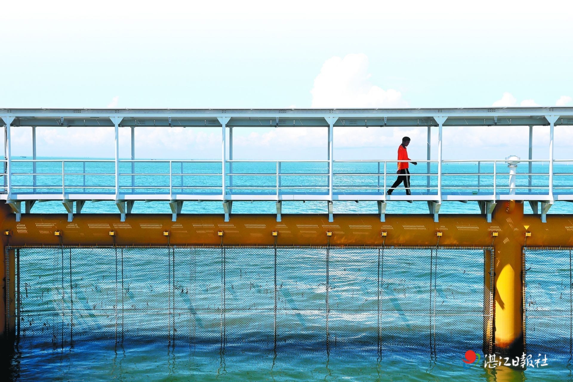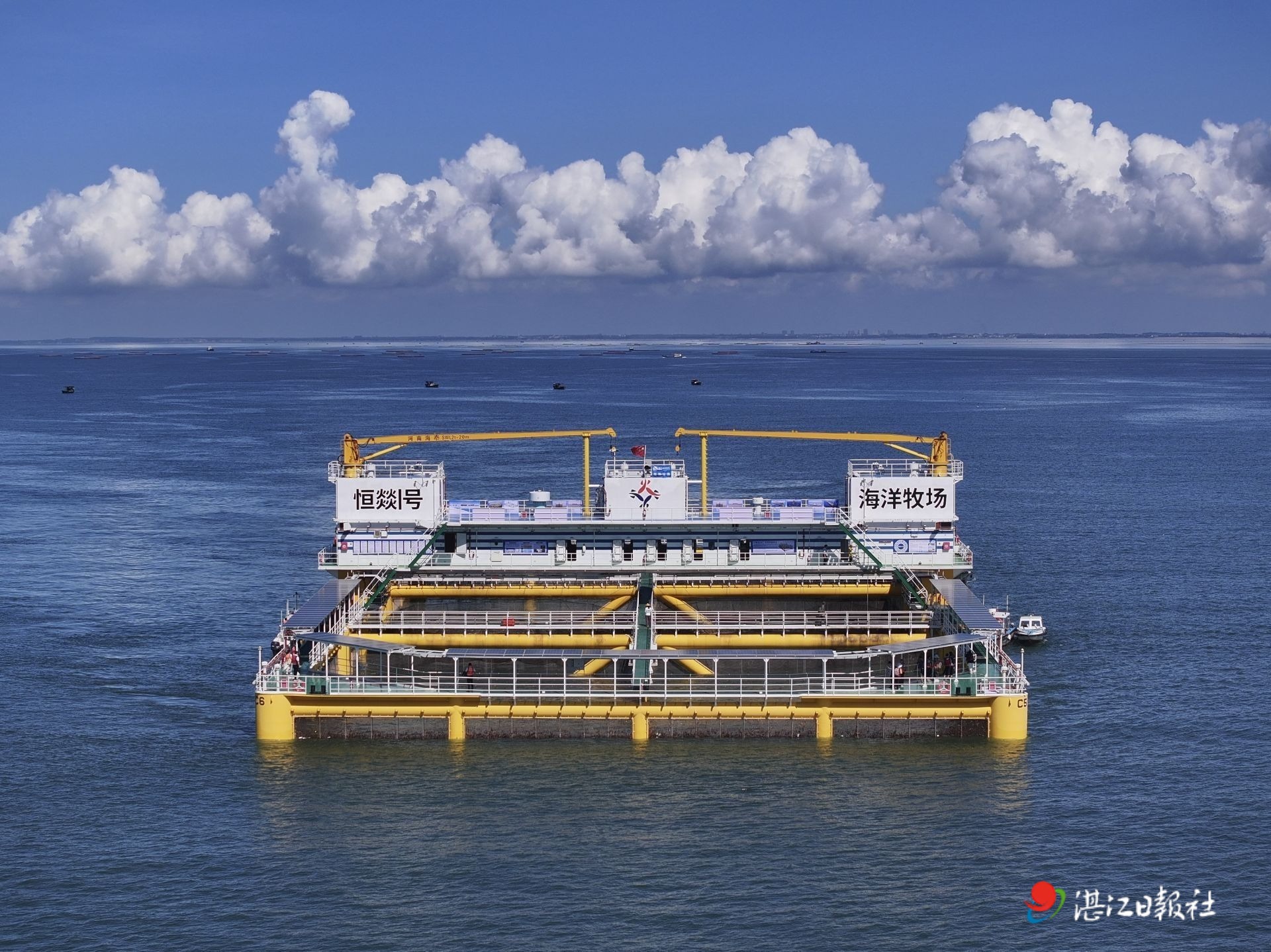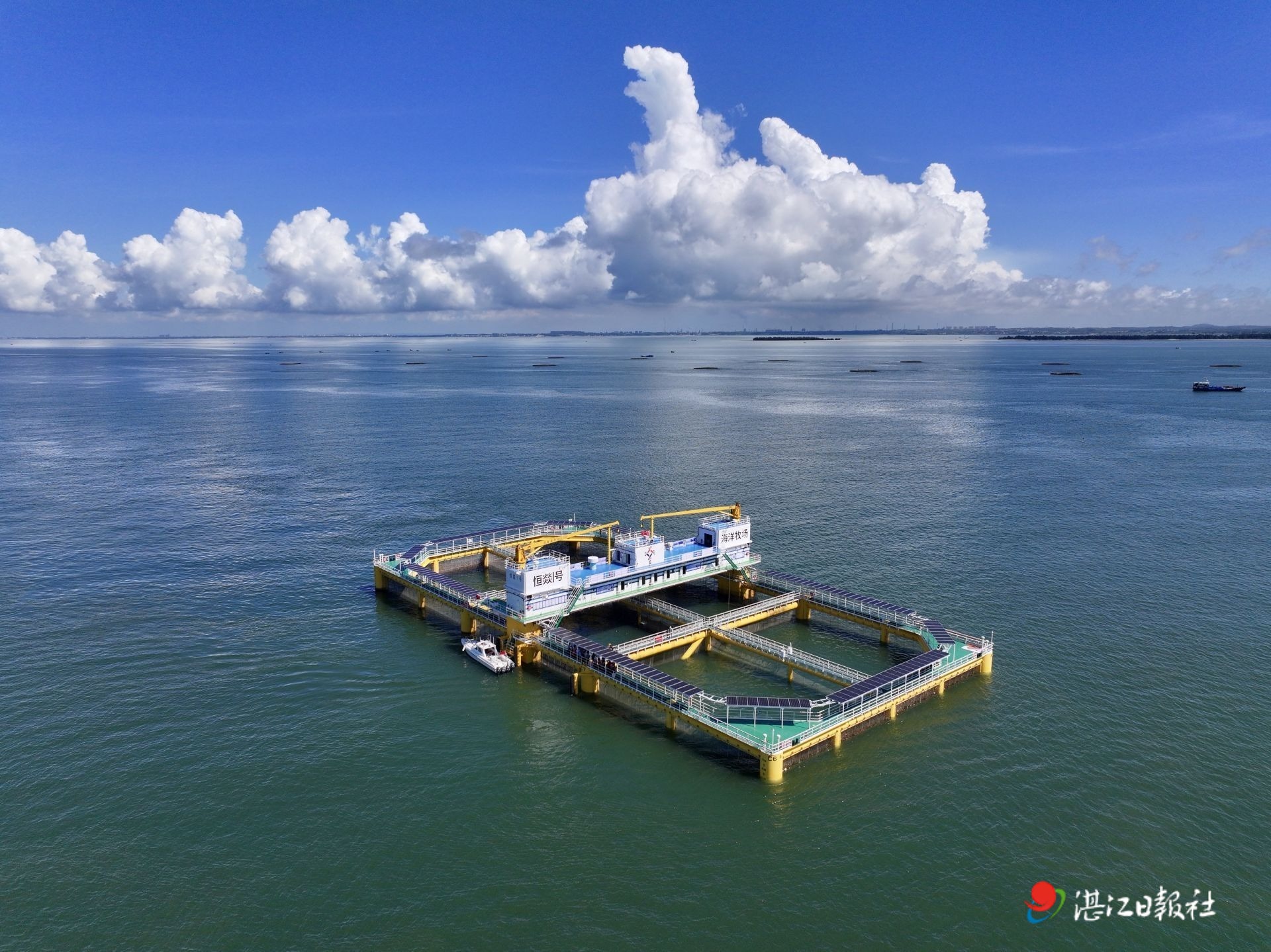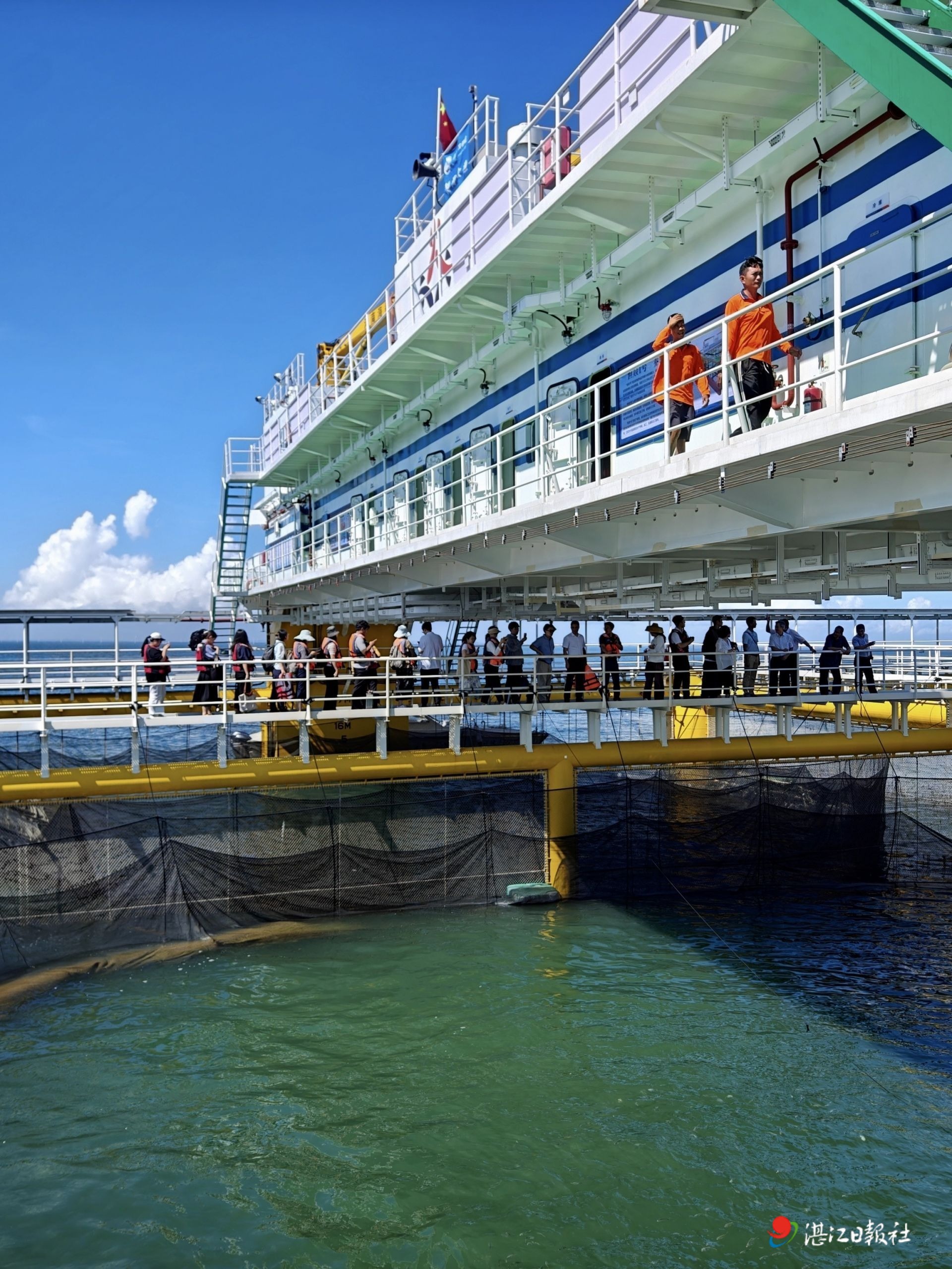 在東海島東南碼頭乘坐快艇出海,一路破浪疾行,歷經半小時,一座巨大的“海上堡壘”才映入眼簾。9月2日,記者登上目前廣東規模最大的海上養殖裝備——半潛錨泊桁架式智能養殖平臺“恒燚1號”。