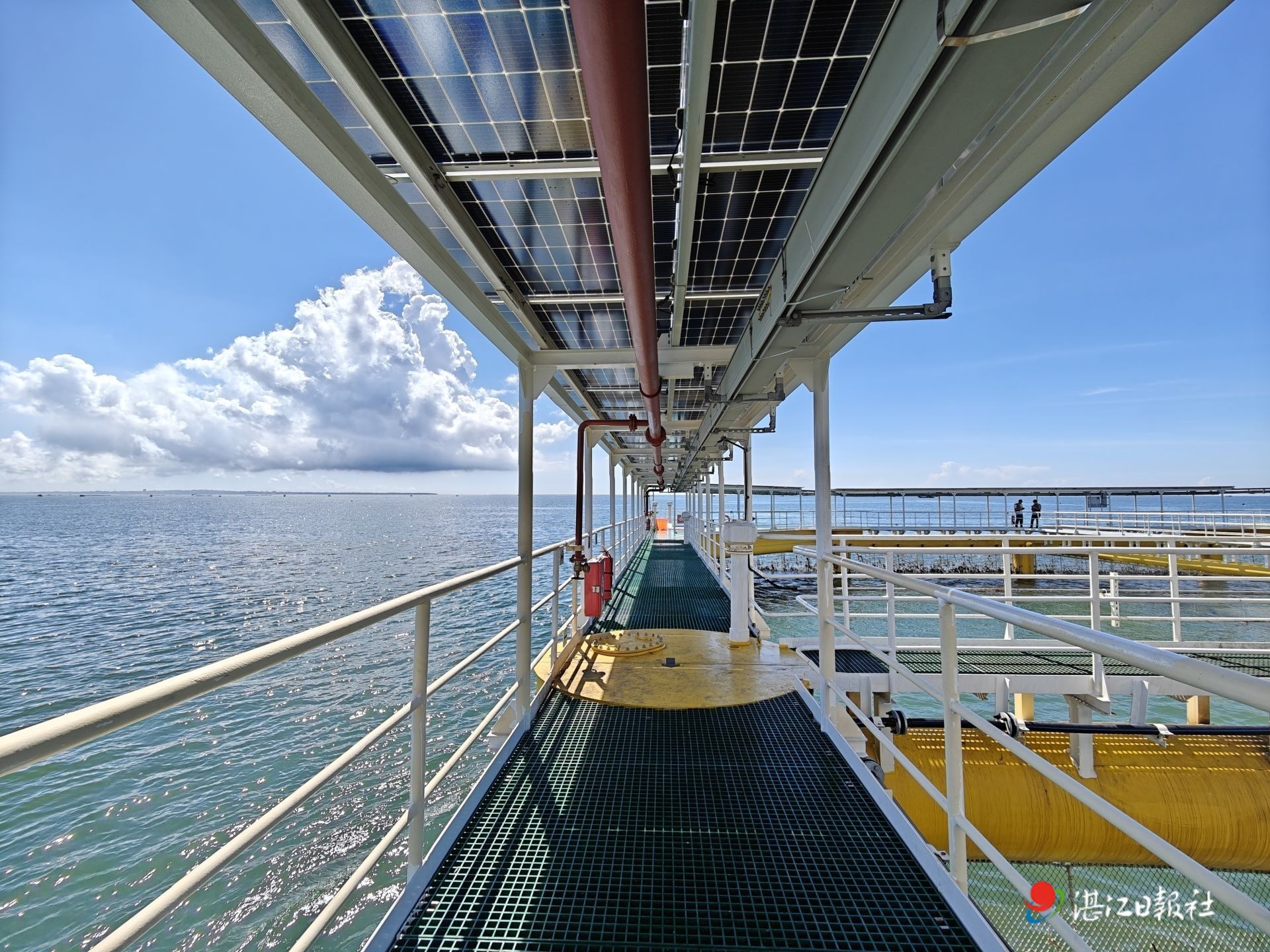 行走在“恒燚1號”的廊道上,記者發現猛烈的陽光都被“屋頂”擋住了,感覺陣陣陰涼。抬頭一看,這“屋頂”竟是一塊塊太陽能電池板構成的。這樣既能遮擋太陽,又能將太陽能循環利用,滿足平臺的日常供電需求,令人感嘆設計者的巧思。