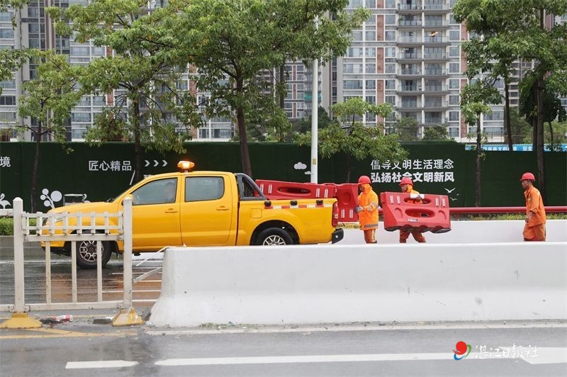 9月7日下午,工作人員撤走交通水馬。湛江海灣大橋恢復(fù)正常通行。記者李忠 攝