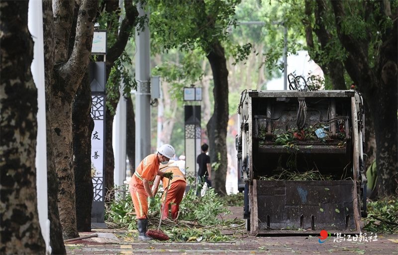 9月7日上午,環(huán)衛(wèi)人員在人民大道龍潮村路段清理樹(shù)枝等。記者李忠 攝