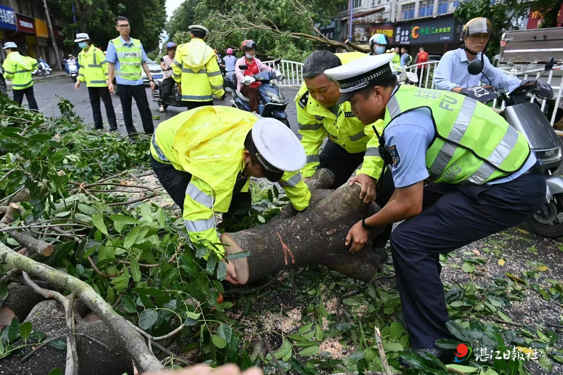 徐聞縣是此次防御臺風最前線,“摩羯”過境后,當地許多樹木、廣告牌、路燈、交通標志牌被吹倒,部分路段積水嚴重。湛江公安組織應急警力第一時間深入受災區域,開展緊急救援行動。民警使用清障工具冒雨逐一將被臺風吹倒和影響通行的樹木樹枝進行清除,在積水路段及時設置標識,協助相關部門清理路面垃圾、疏通排水系統。同時,檢查恢復交通信號設施,并巡查高速公路,確保安全后再啟動全線通行。