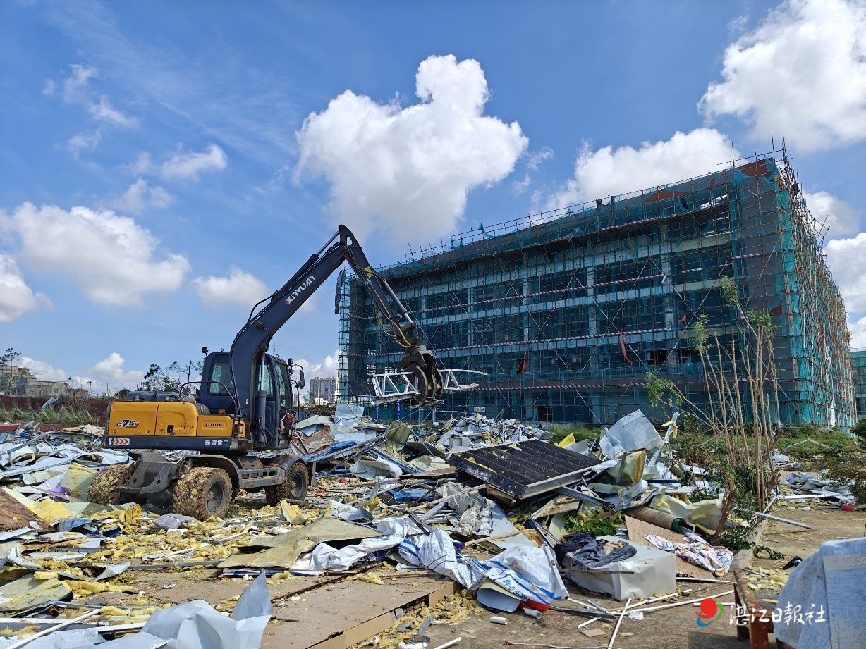 12日上午,記者來到徐聞縣圖書館、博物館兩館在建項目施工現場看到,有挖掘機對破損的集裝箱等進行壓實轉運,工人正在對破損的設施進行清理。截至目前,9個全新的住人集裝箱已安裝完畢,仍需繼續安裝近60個。據施工方介紹,前幾天已有工人和機械進場清障以及安裝相關設施,當前正在加快復工搶修搶建進度,預計3天左右可具備復工條件。超強臺風“摩羯”讓包括辦公、住宿區域的工地設施受災,但滯留工人得到徐聞文旅部門的及時轉移并妥善安置,安全渡過難關。