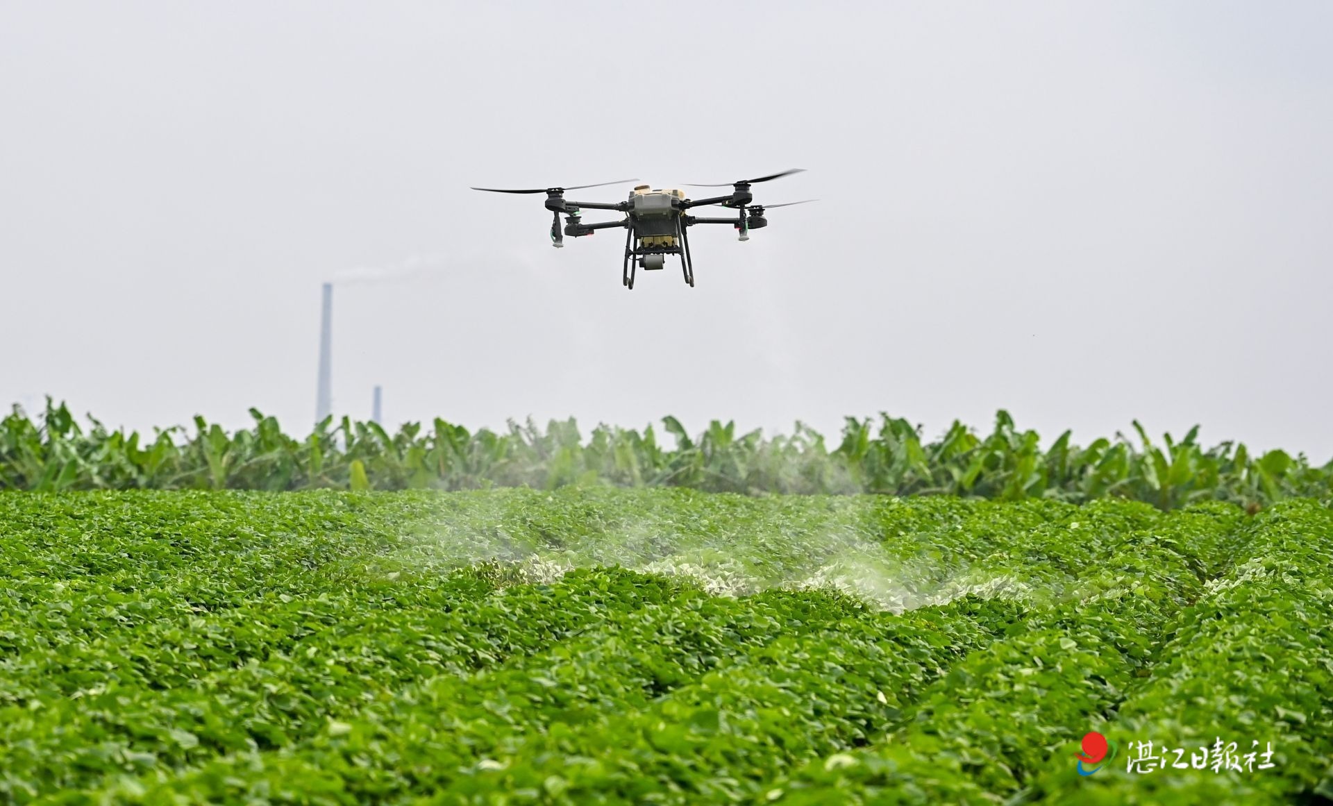 廣前公司甘薯種植基地,“低空+智慧農業”應用場景展示無人機噴淋作業。