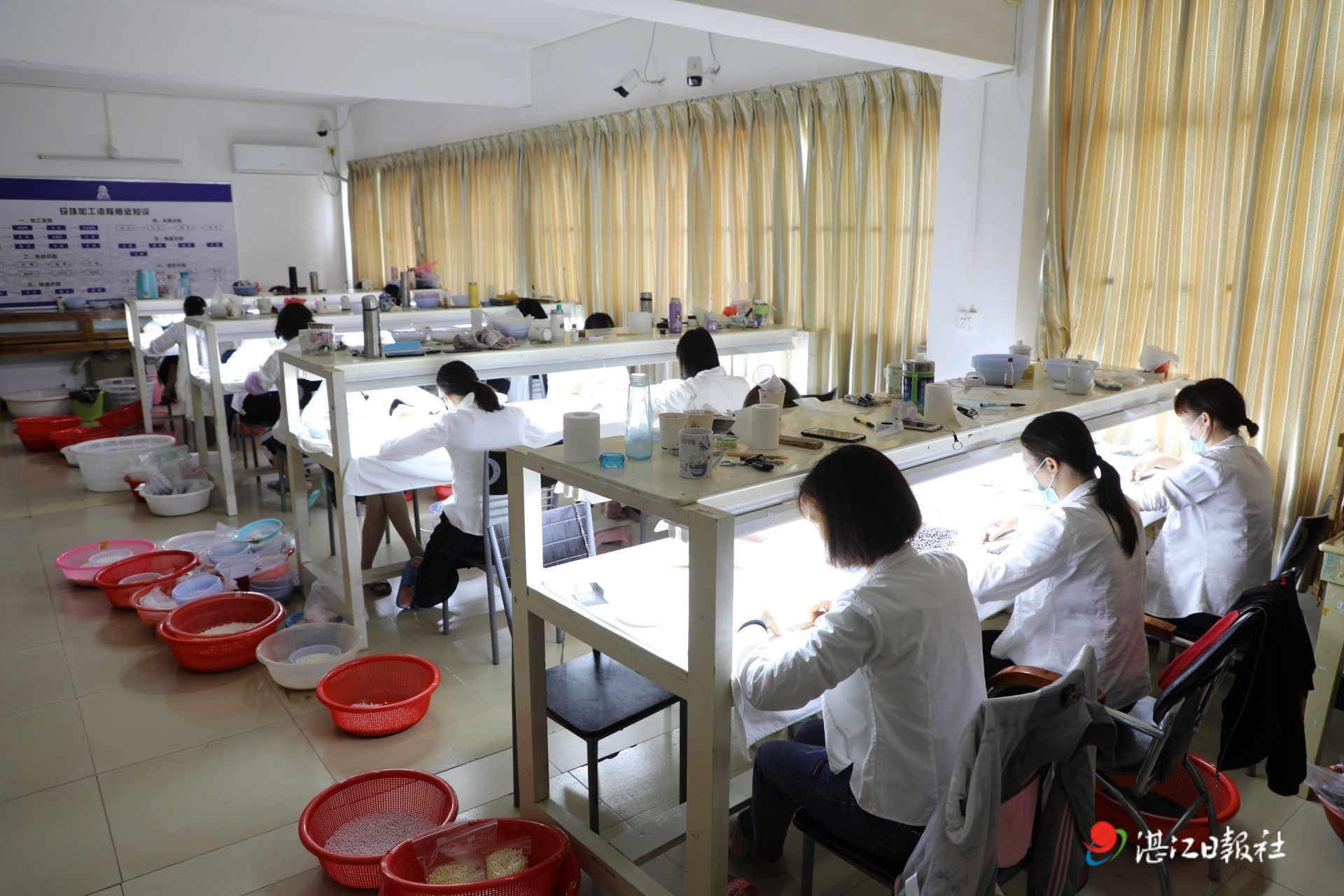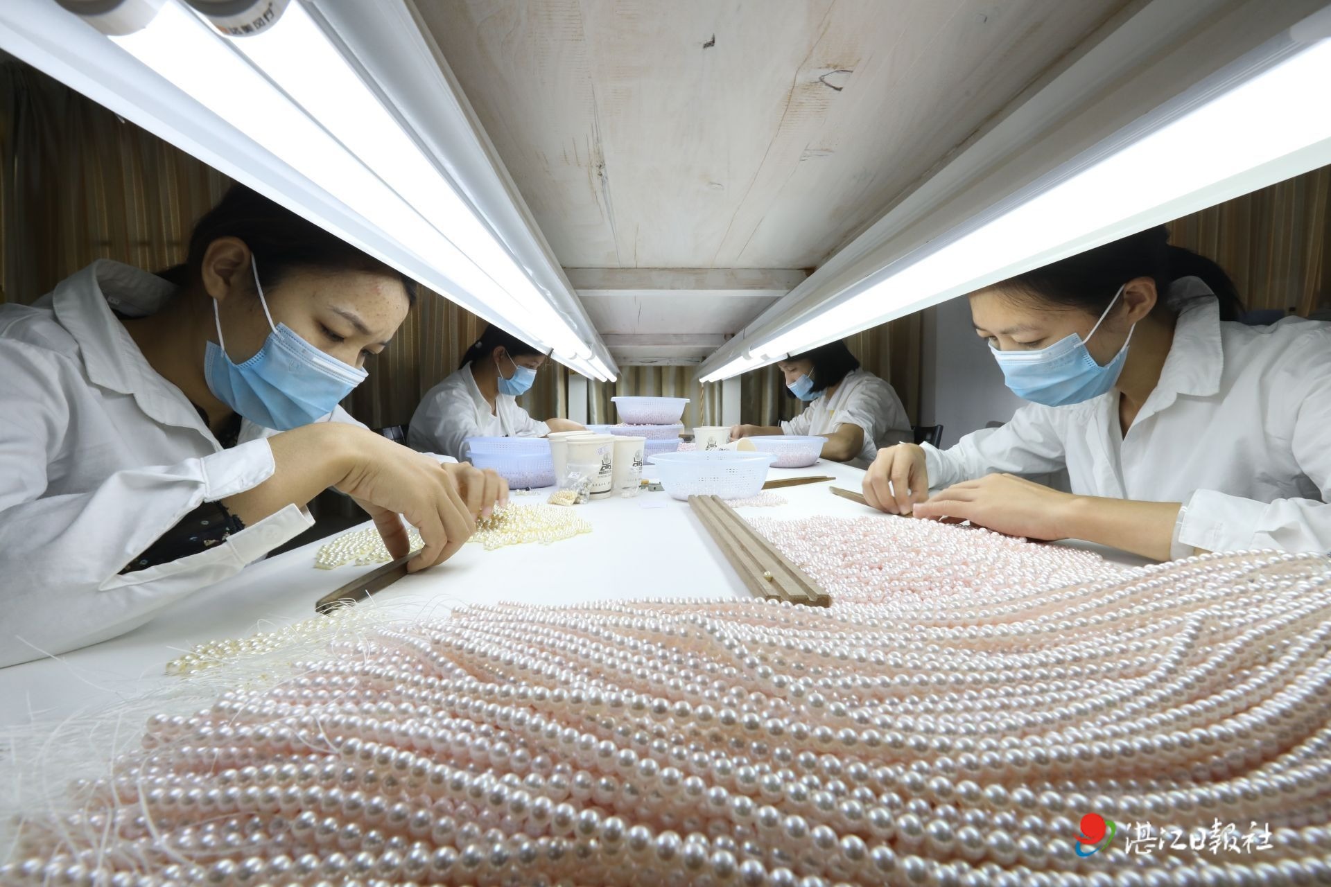 雷州市覃斗鎮流沙港尊鼎珍珠生產基地,工作人員正在加工珍珠。