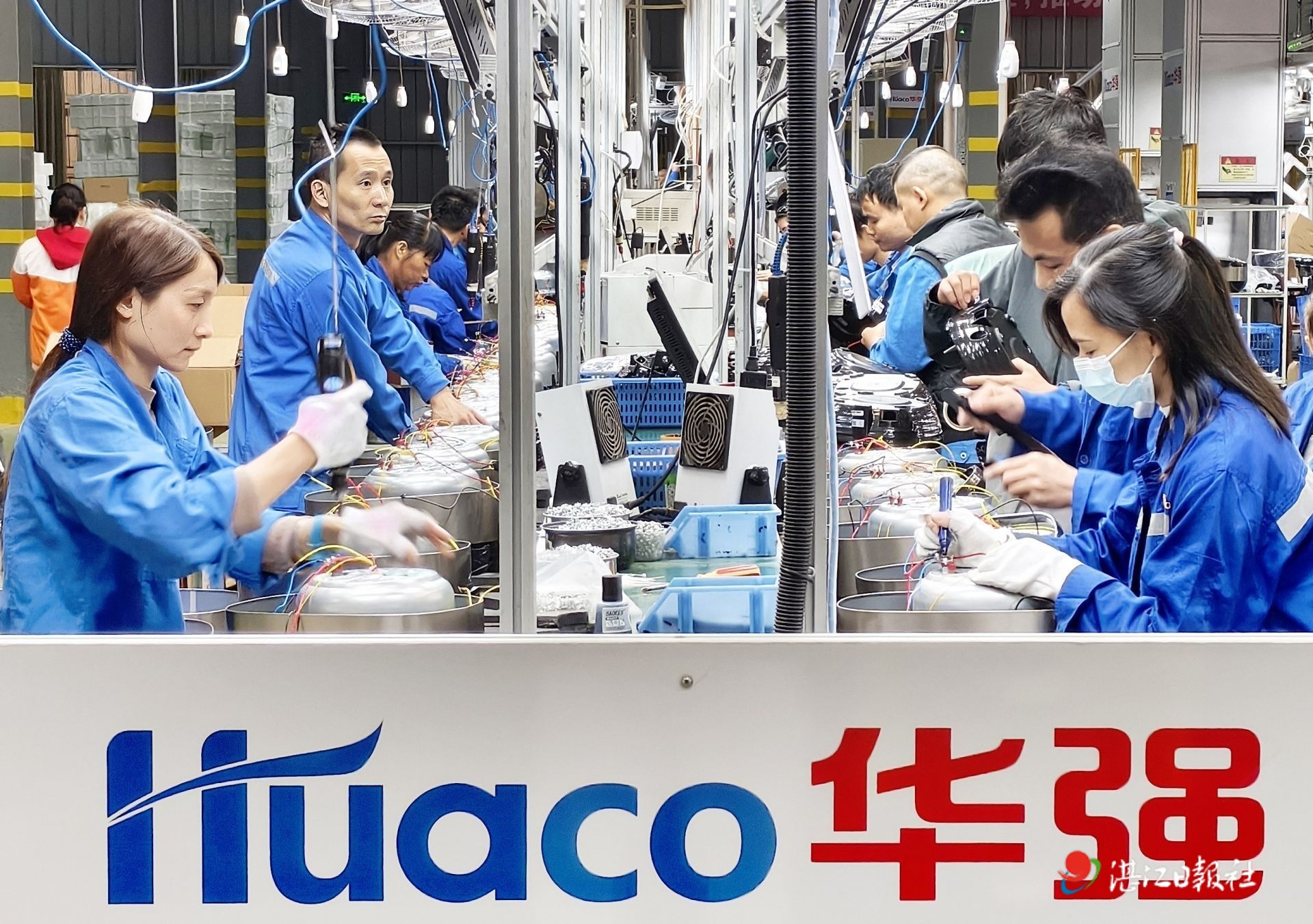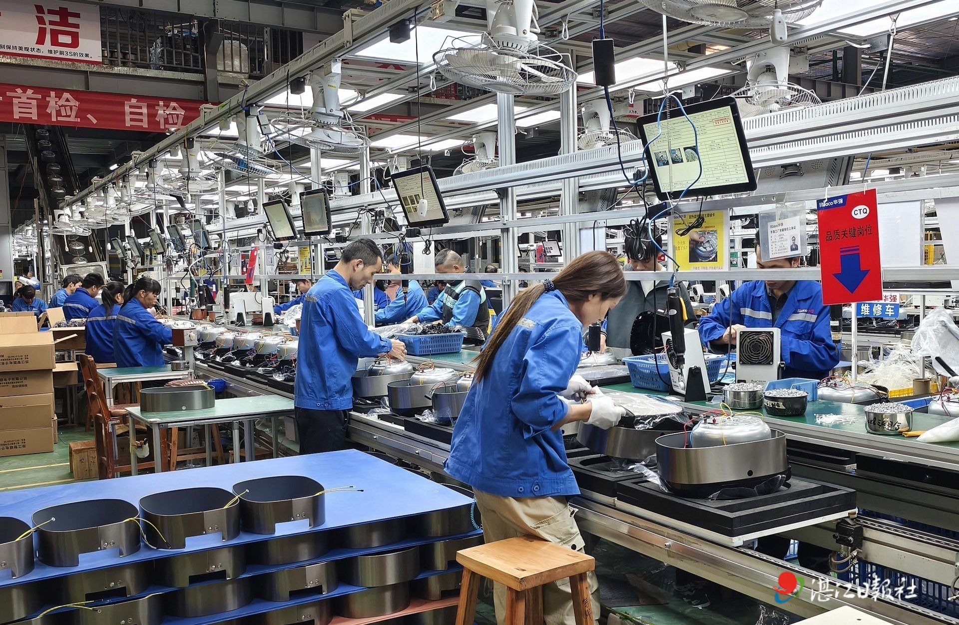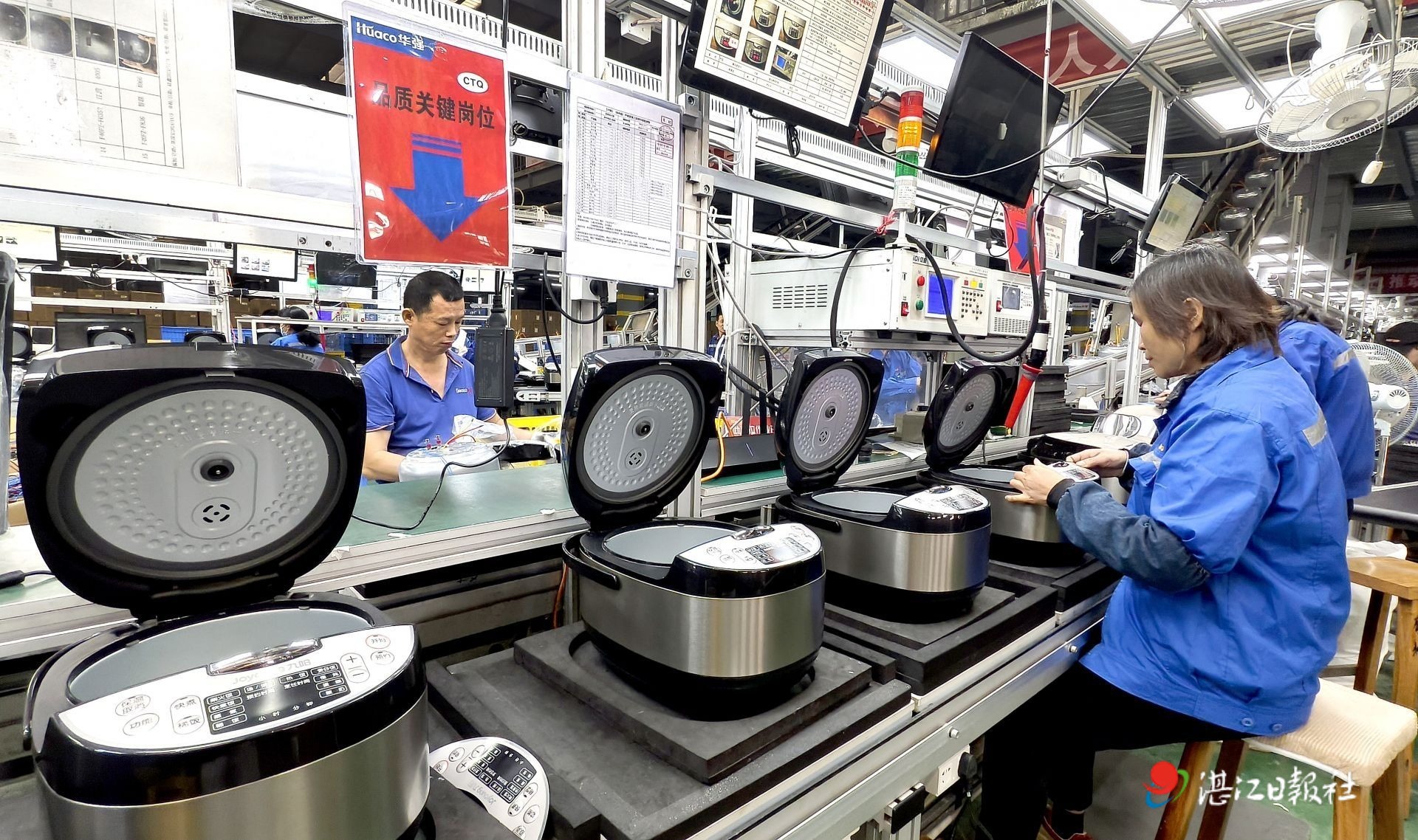 12月13日,記者走進位于廉江高新技術開發區規模最大、集研發、生產、銷售于一體的小家電企業——廣東華強電器集團有限公司生產車間,智能自動化生產線上機器忙碌地揮舞著機械臂,將原材料不斷生成半成品,然后由輸送帶輸送至下一道工序。在電飯鍋智能裝配車間內,工人們分工負責,一道接著一道工序,組裝起款式多樣的電器產品。裝配好后,產品經過輸送帶自動稱重、自動封箱、自動打帶,產品包裝完成后由碼垛機器人一個個迅速、整齊堆放好,準備出廠運往各地。“現在,我們各條生產線馬力全開,400多名工人在加班加點趕訂單。12月份我們需要完成20萬多臺電飯鍋,目前已經完成過半。”華強電器集團廠長陳惠漢介紹說。