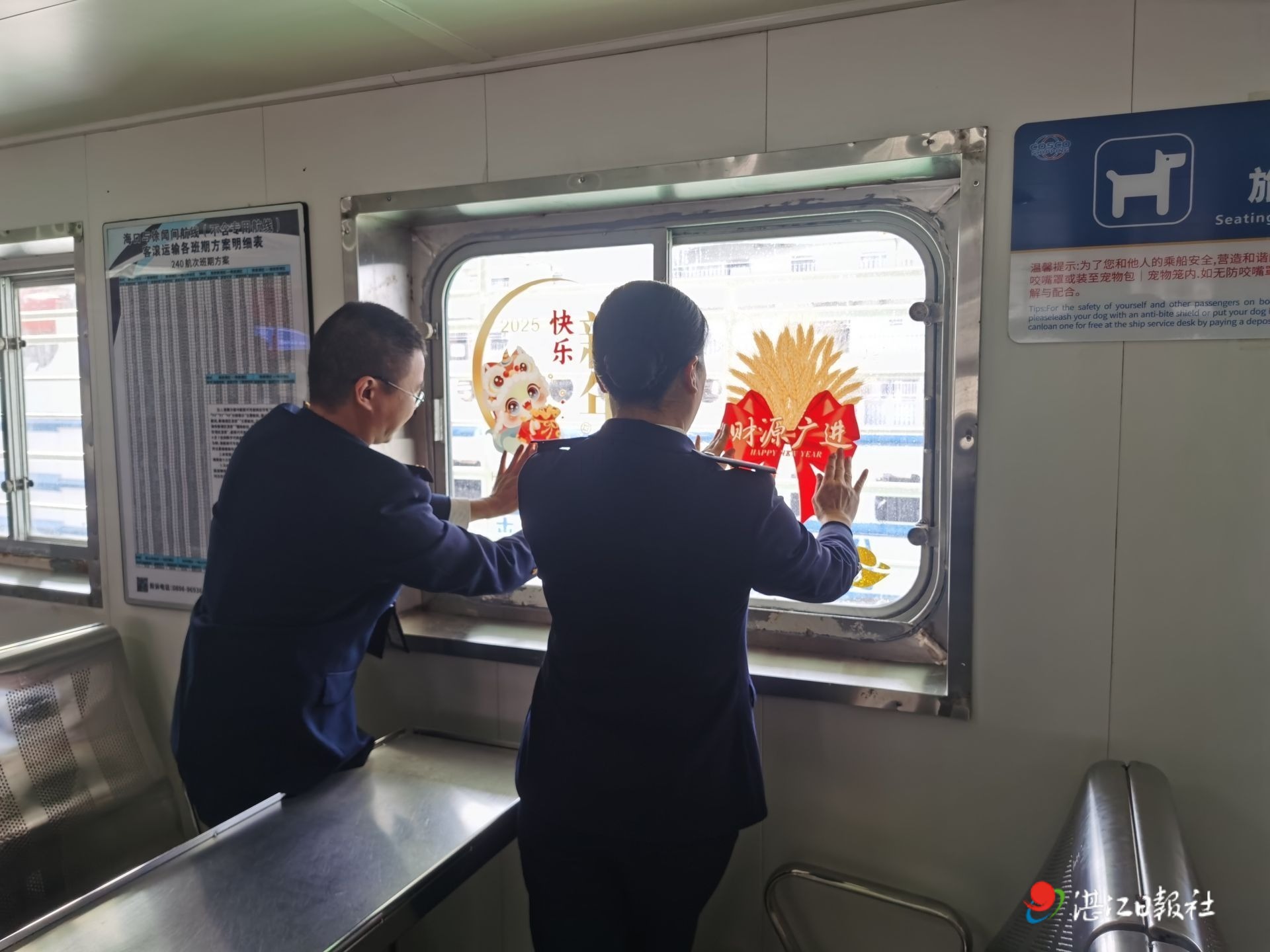 除了做好監管工作,隨船海事人員還積極為船員和旅客提供幫助。遇到行動不便的老人和小孩,他們會主動上前攙扶,幫忙提拿行李;當旅客對乘船流程不熟悉時,他們會耐心地講解引導……值此新春佳節,他們和船員們一起貼窗花、掛燈籠,為客滾船增添了濃濃的年味,與船員、旅客們一起聊家常、分享新年的喜悅,共慶新春。“有海事人員和我們一起過年,感覺心里特別踏實。”一位船員感觸地說道。
