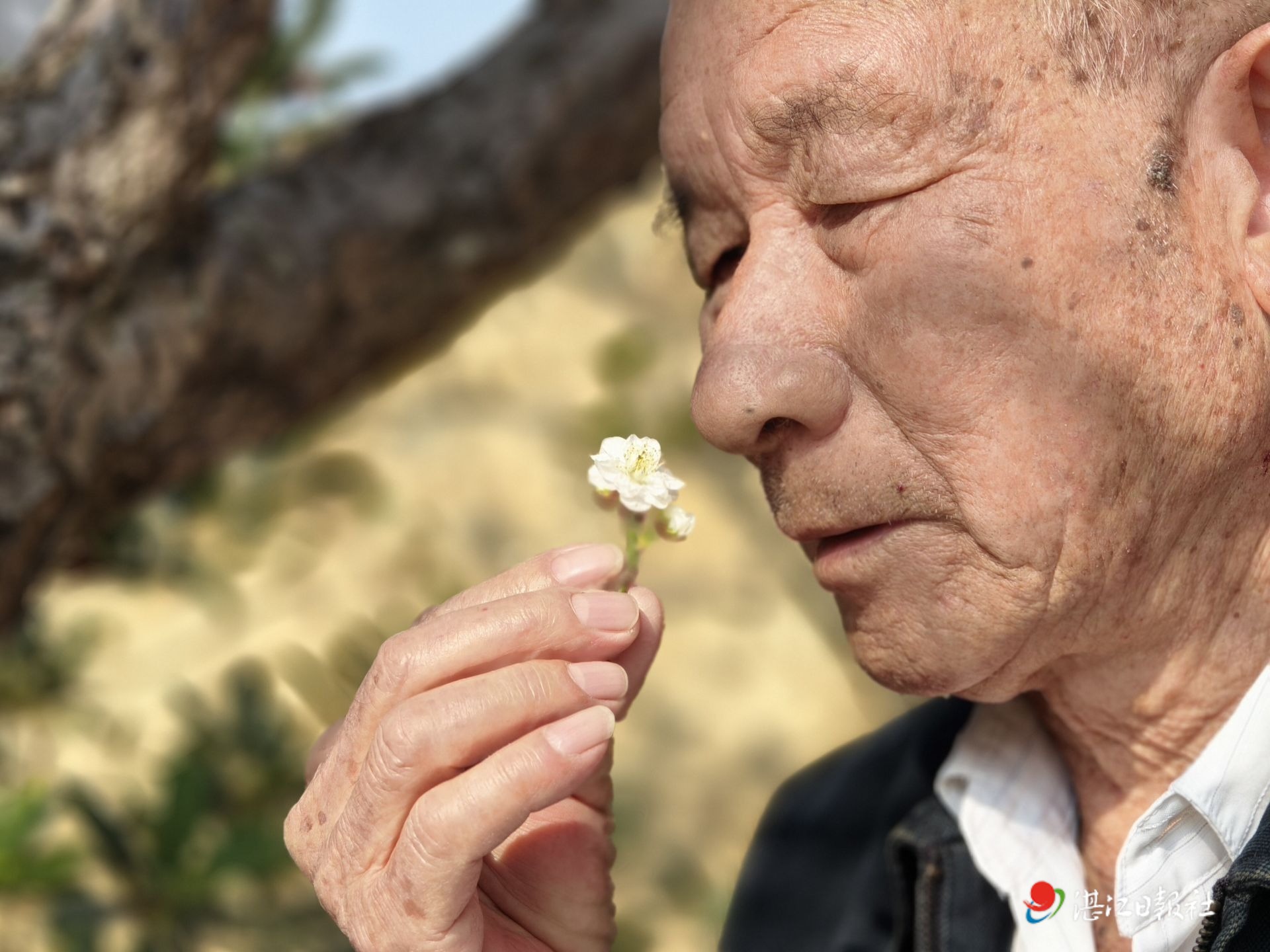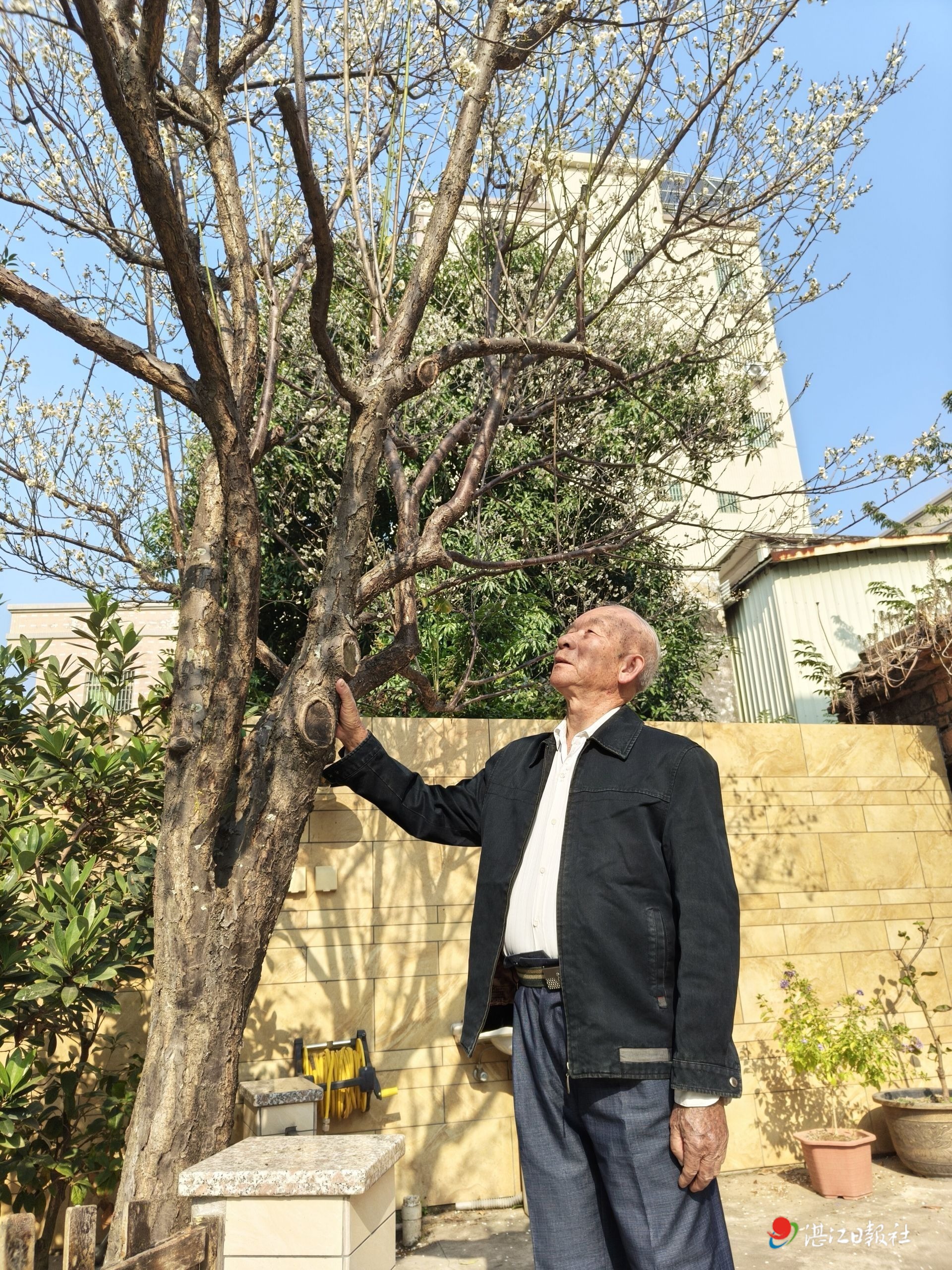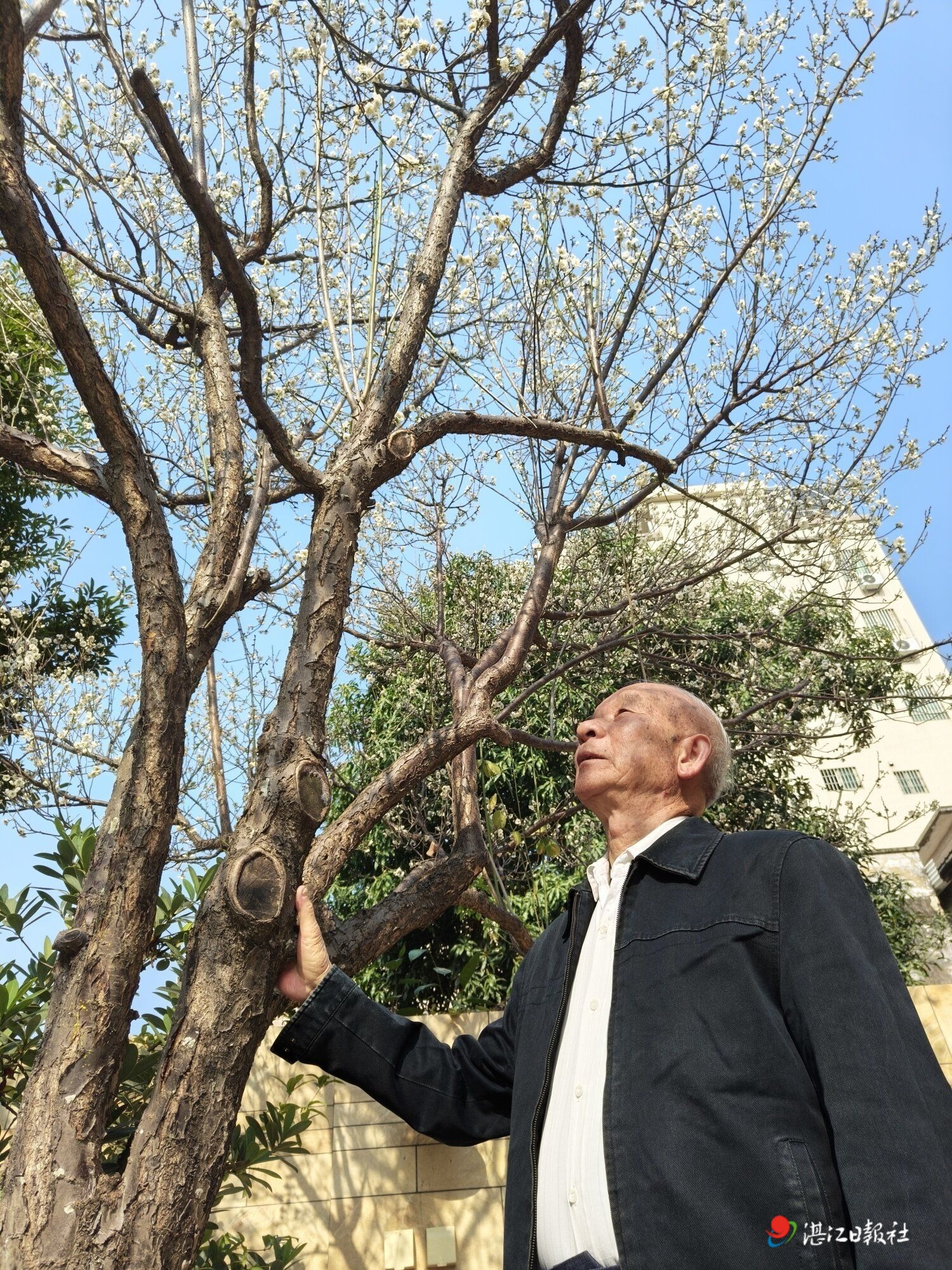 在吳川梅菉一戶人家的梅樹下,李茂森深情地望著滿樹梅花。