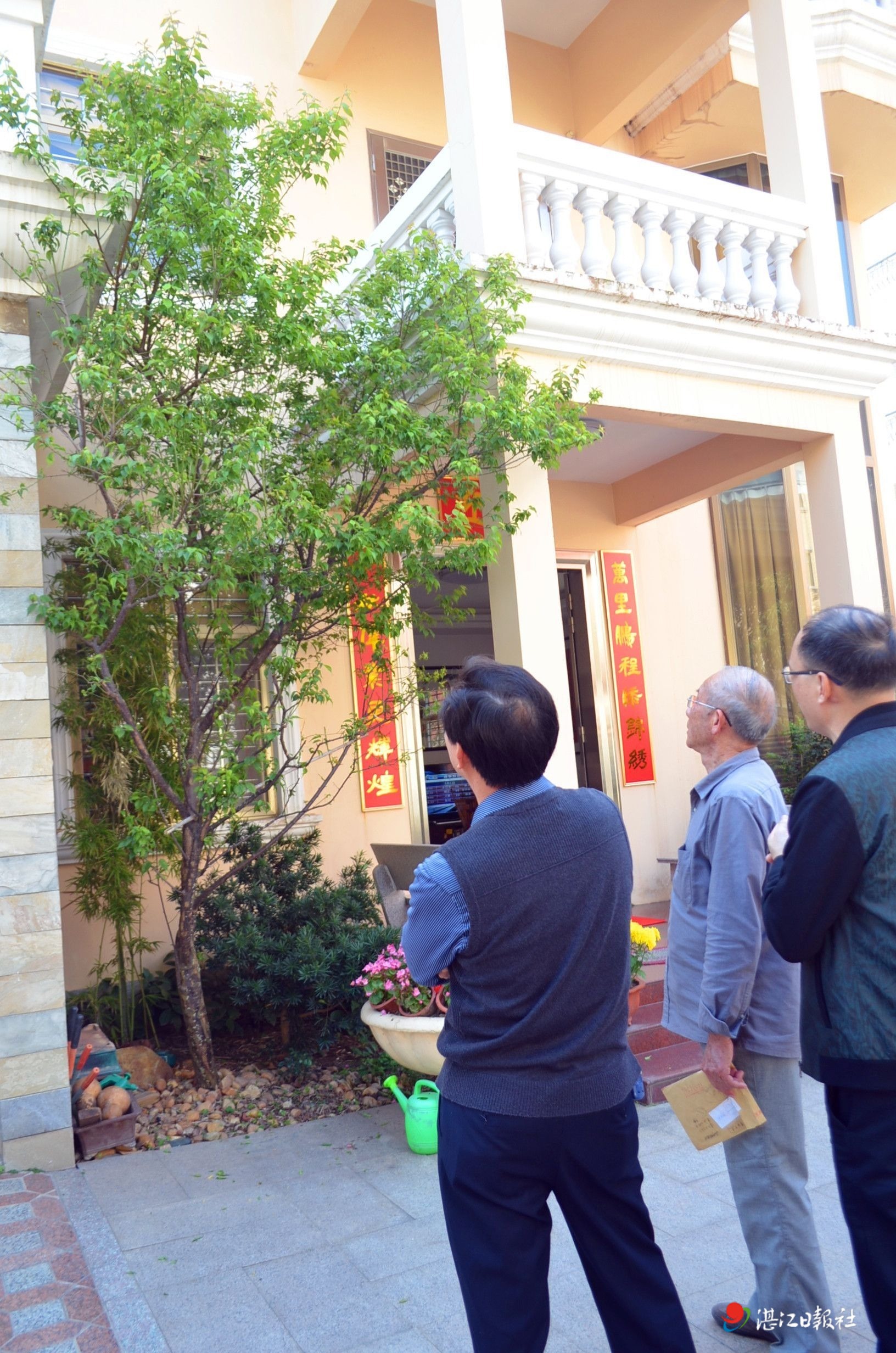 李茂森(中)和友人在吳川城區(qū)一戶人家察看玉蝶梅長勢。