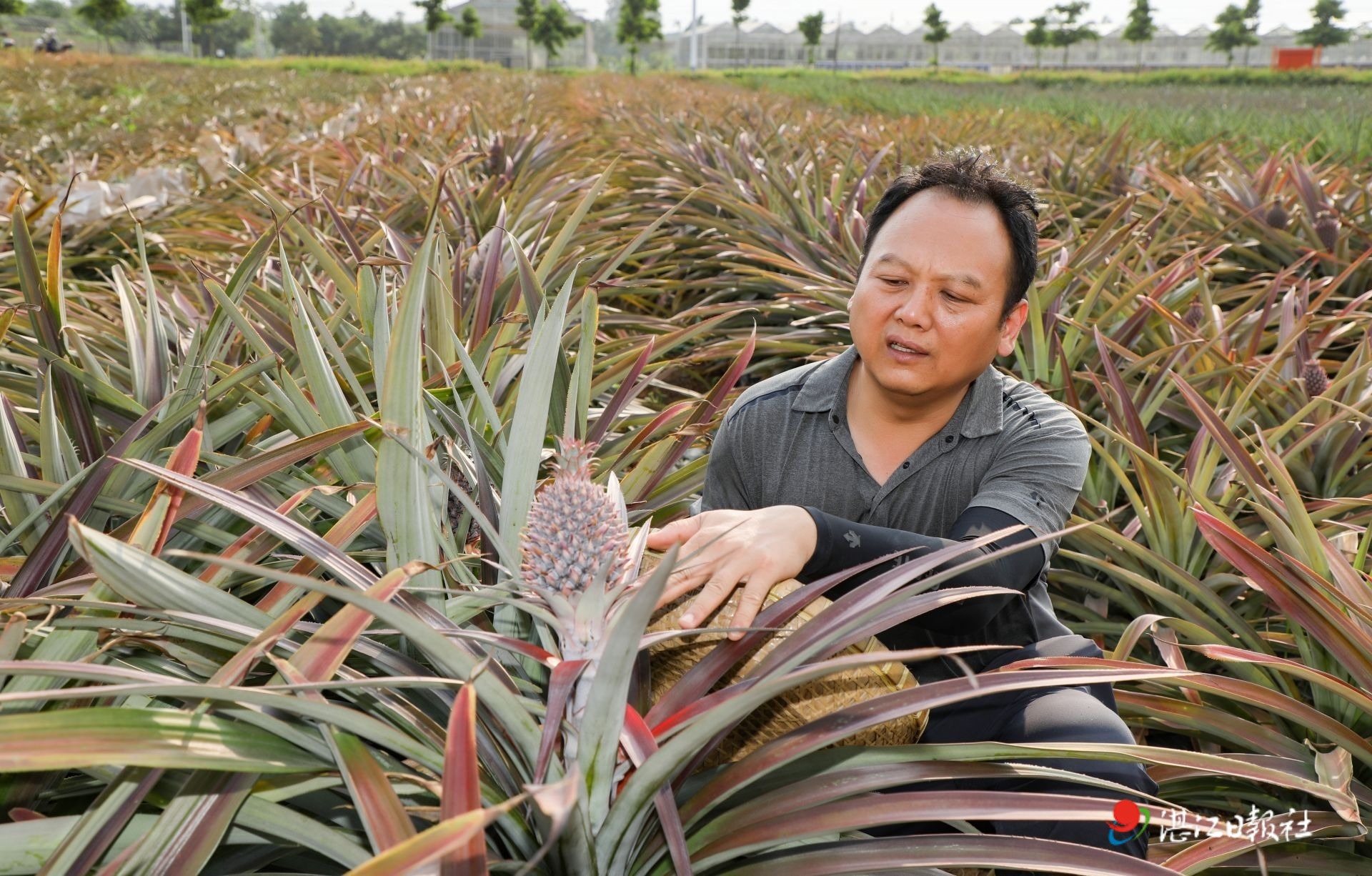 南亞所菠蘿新品種選育基地,科研工作者正在觀察菠蘿苗生長情況。