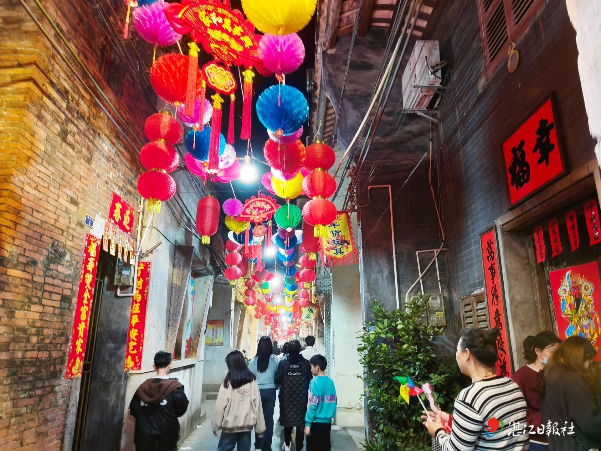 晚上8時多,記者在漳州街看到,全長380多米的漳州街燈光璀璨、人潮涌動,游客們穿梭在流光溢彩的老街之間,欣賞非遺文化泥塑和書畫作品,感受中國傳統文化的獨特魅力。整條街道裝飾以傳統年味為主題,懸掛著喜慶的走馬燈,街道兩旁掛滿了紅色燈籠,穿插著五彩的荷花狀燈飾,同時還精心布置了文化長廊,介紹“梅菉墟十二行”“梅菉墟名勝古跡原遺址”以及展示書畫作品等,游客邊走邊欣賞,不時舉起手機相機拍照留念,感受老街韻味,領略老街獨有的風情和傳統文化魅力。