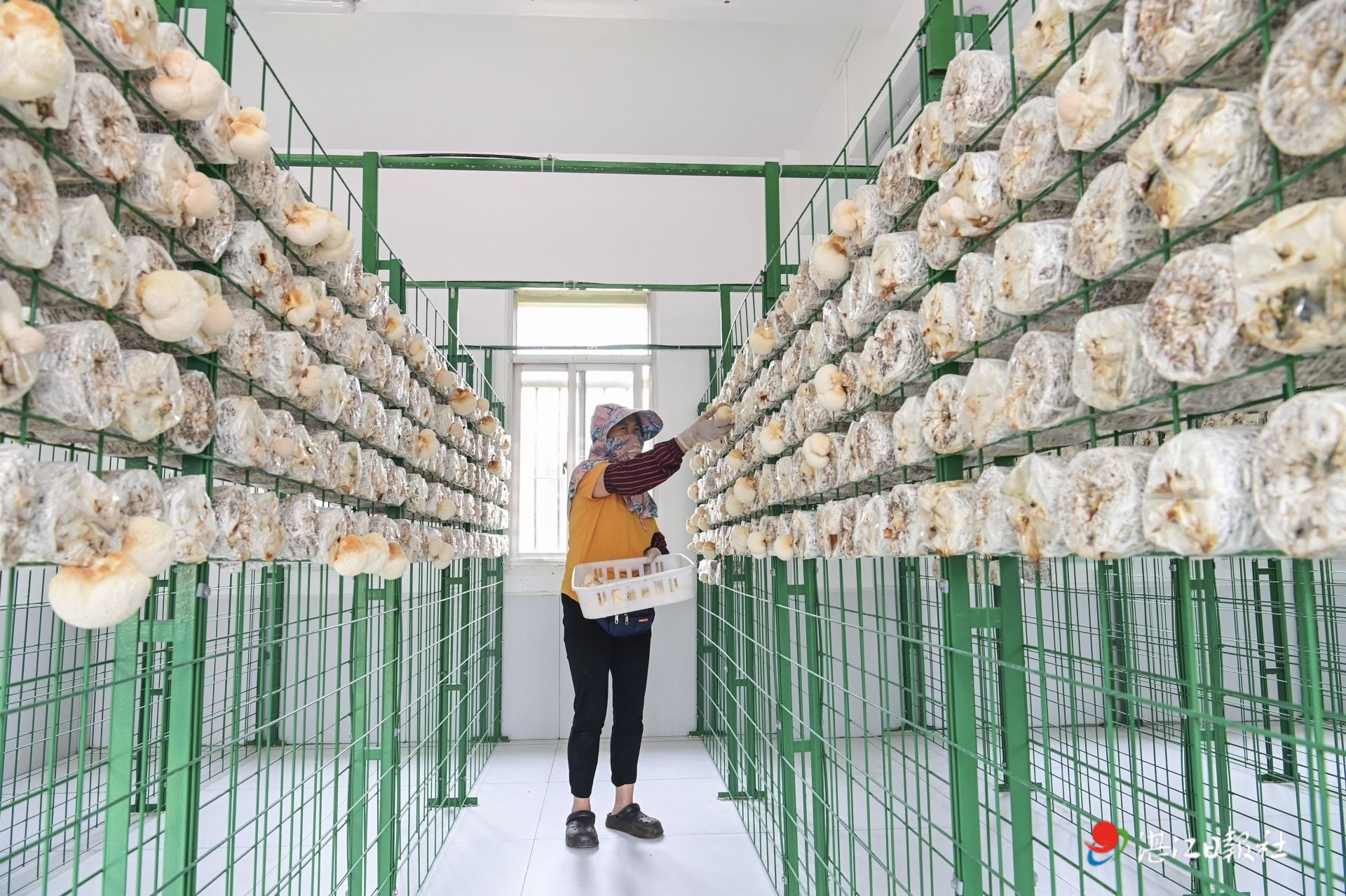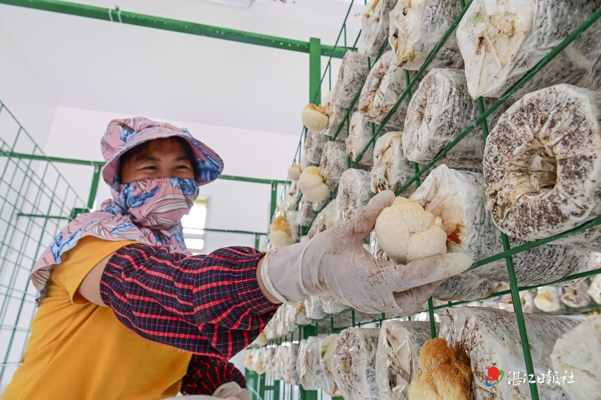 工作人員在采摘猴頭菇菌棒。