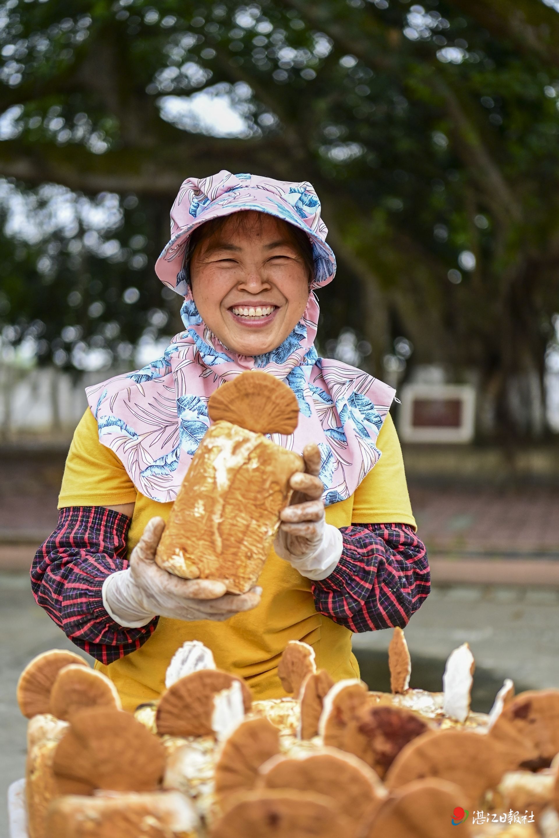 工作人員捧著采摘的靈芝,笑靨如花。