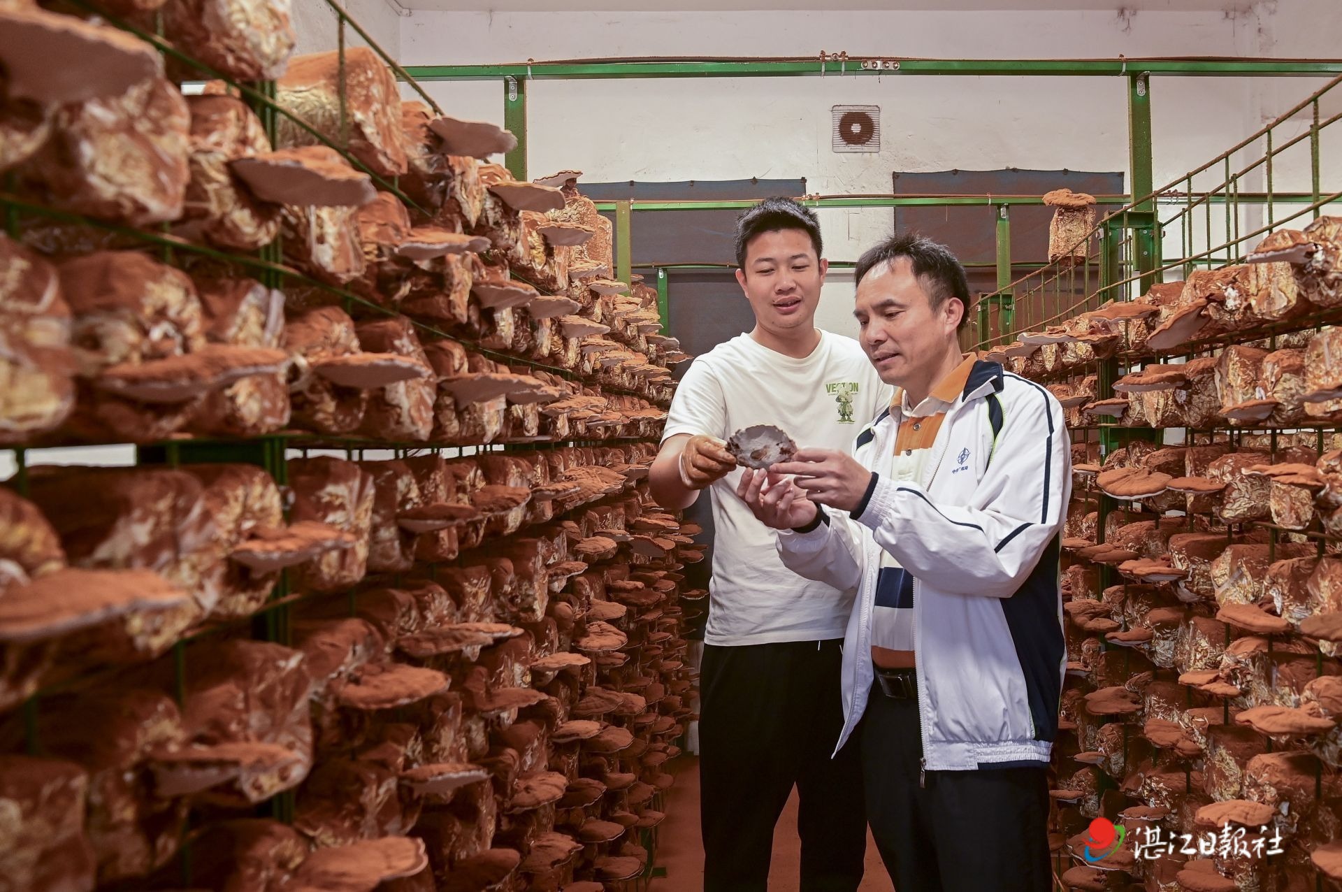 駐遂溪縣界炮鎮幫鎮扶村工作隊隊員在查看靈芝生長情況。
