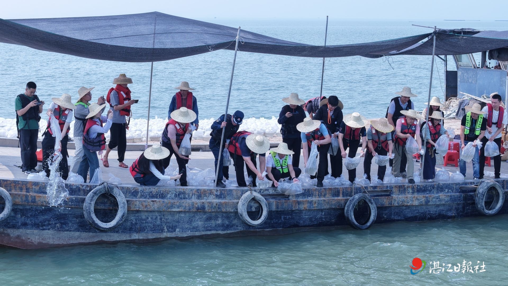 上午10時許,廉江市相關單位部門人員,以及社會各界的參與者,在漁政部門技術人員的指導下有序開展放流。工作人員嚴格按照規范對苗種進行鹽度馴化后,一袋袋充氧包裝的魚蝦苗緩緩入海,被精準投放至目標海域。