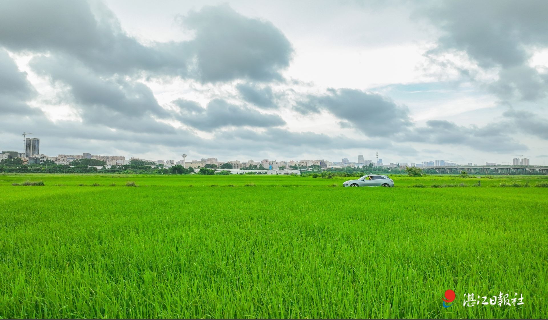 小滿時節,萬物初盈、雨水充沛,谷物茁壯成長。 當日的午后,多云的天氣取代了上午的艷陽高照,在赤坎區西城快線黎湛鐵路跨線橋北側的一片農田里,郁郁蔥蔥的水稻在微風中輕輕搖擺,滿是希望的景象。