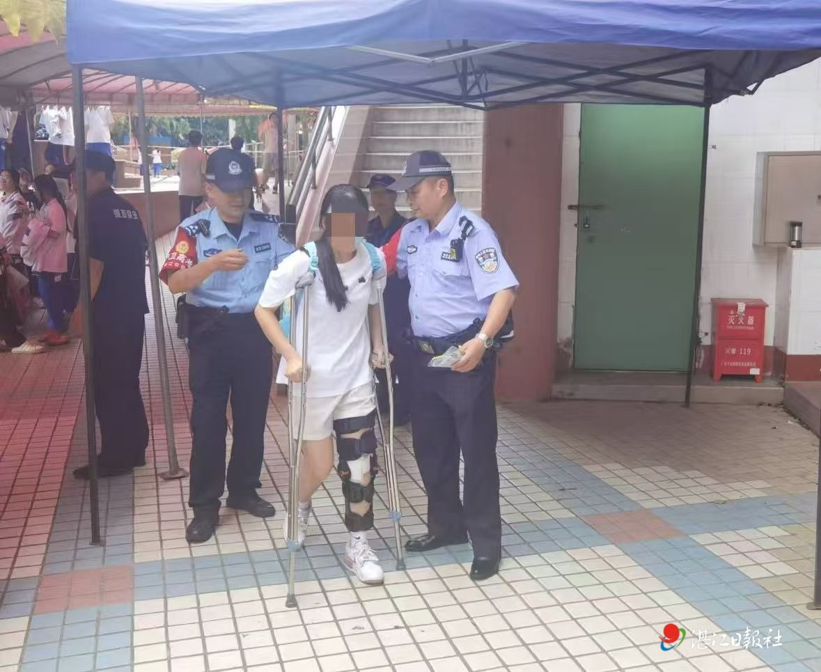 趕考路上的小意外,牽動(dòng)著護(hù)考民警的心。6月7日7時(shí)40分,湛江市第二十中學(xué)初中部考點(diǎn),一名考生在匆忙趕路時(shí)不慎劃傷了腿部,血珠滲出,疼痛讓他眉頭緊鎖,急忙向執(zhí)勤點(diǎn)民警求助。