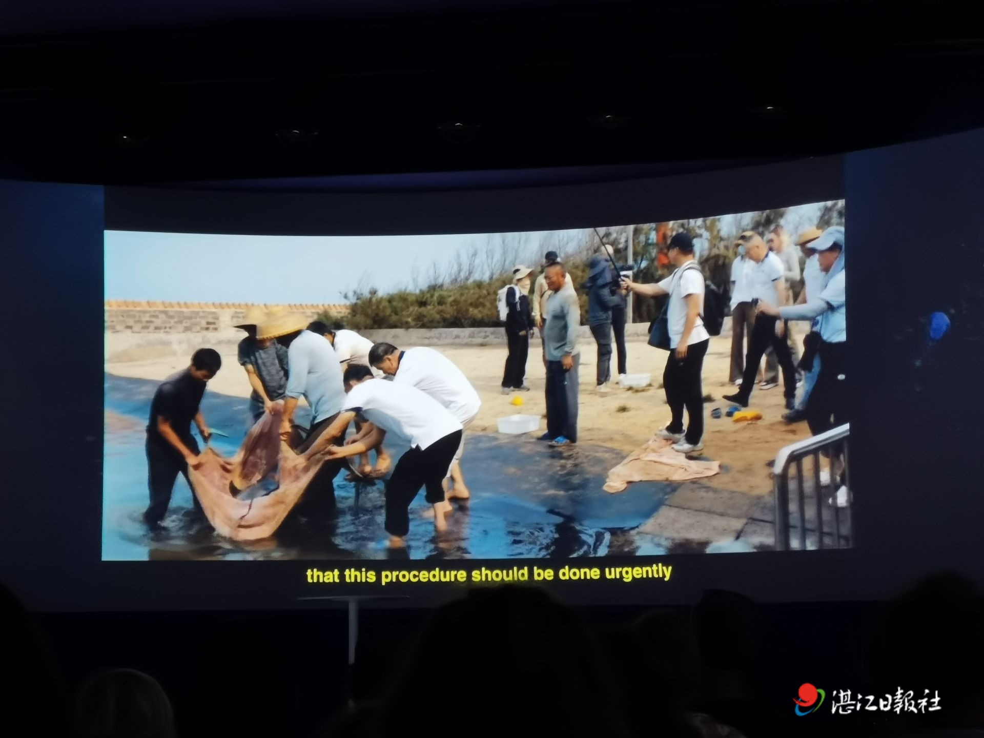 展映現場,中法人員聯合救助海豚的畫面令在場觀眾動容——5月6日,正在湛江的法國拍攝團隊來到南三島海域,不僅拍攝了救助擱淺海豚的全程,還親自給海豚上藥、喂食。同一天,法國拍攝團隊從東海島東南碼頭出發,在硇洲島附近海域“搜索”3個多小時后,驚喜發現6頭中華白海豚。