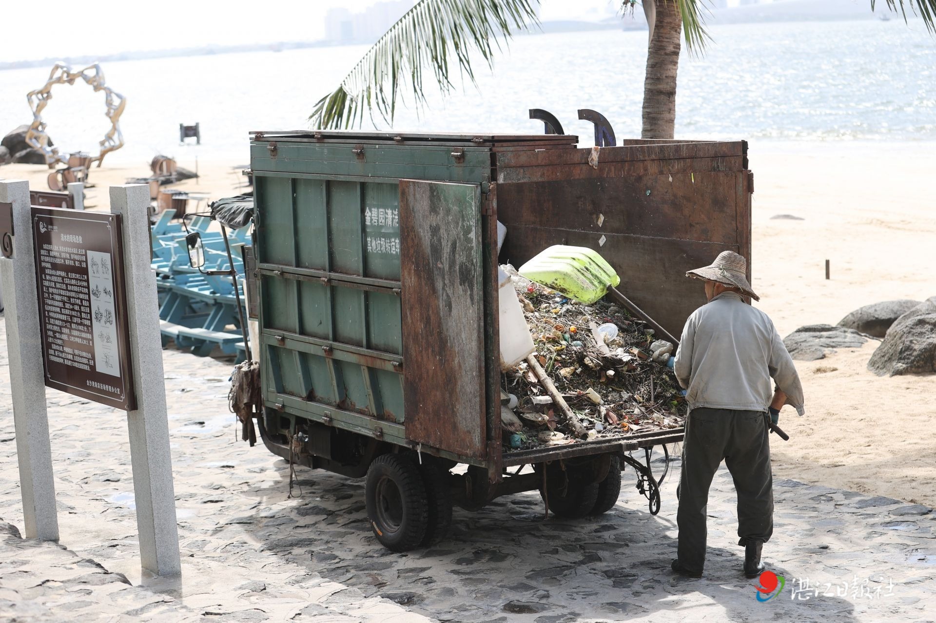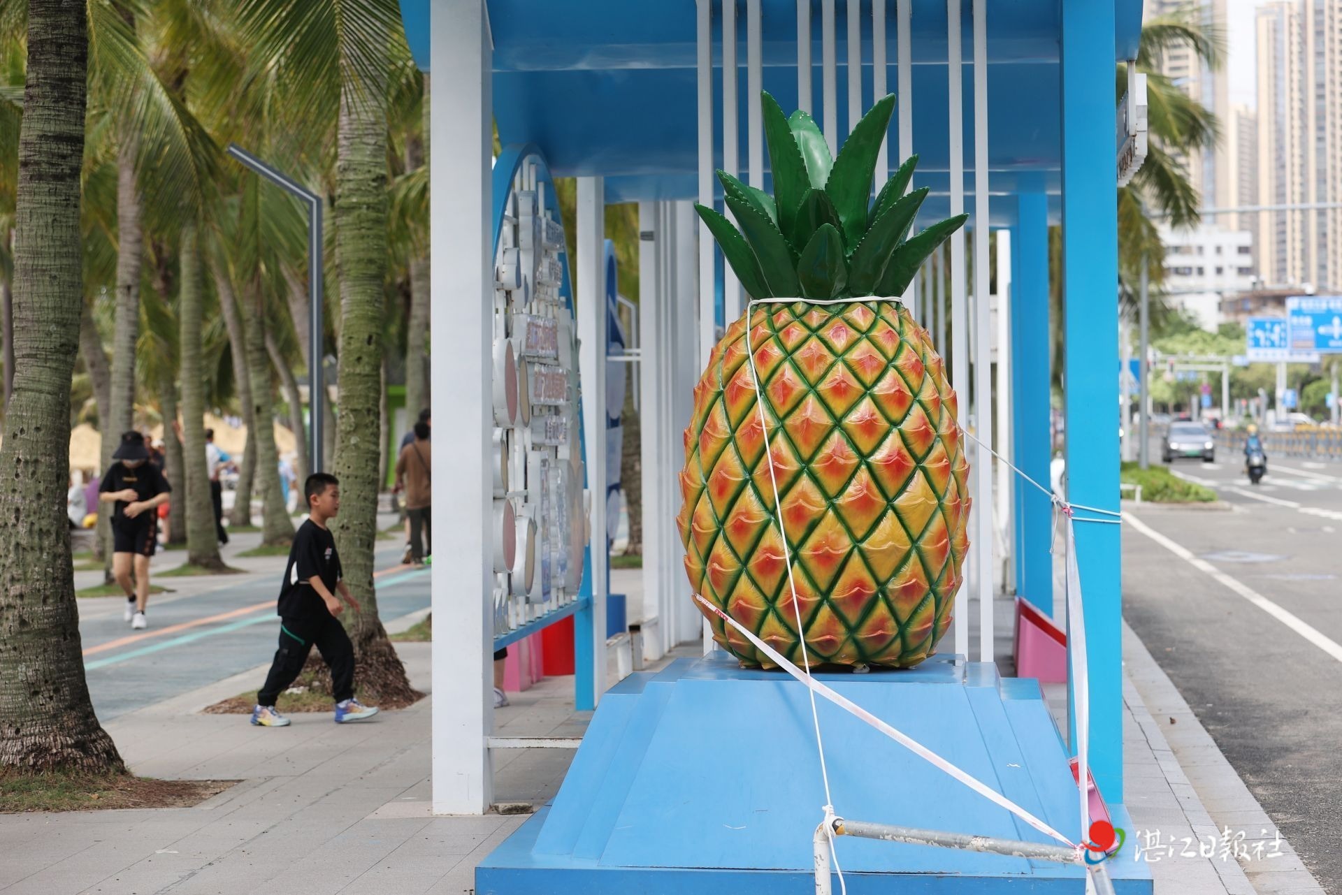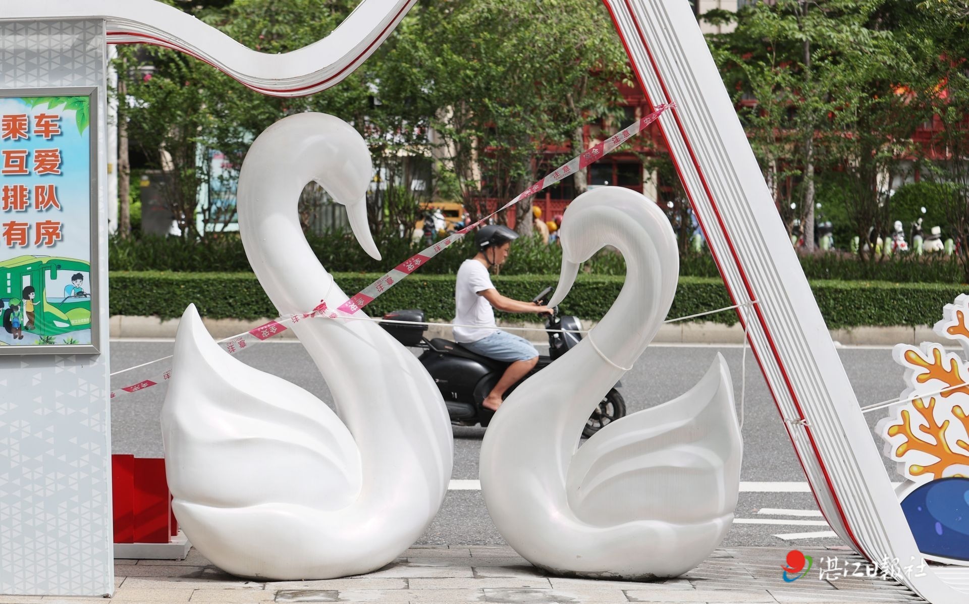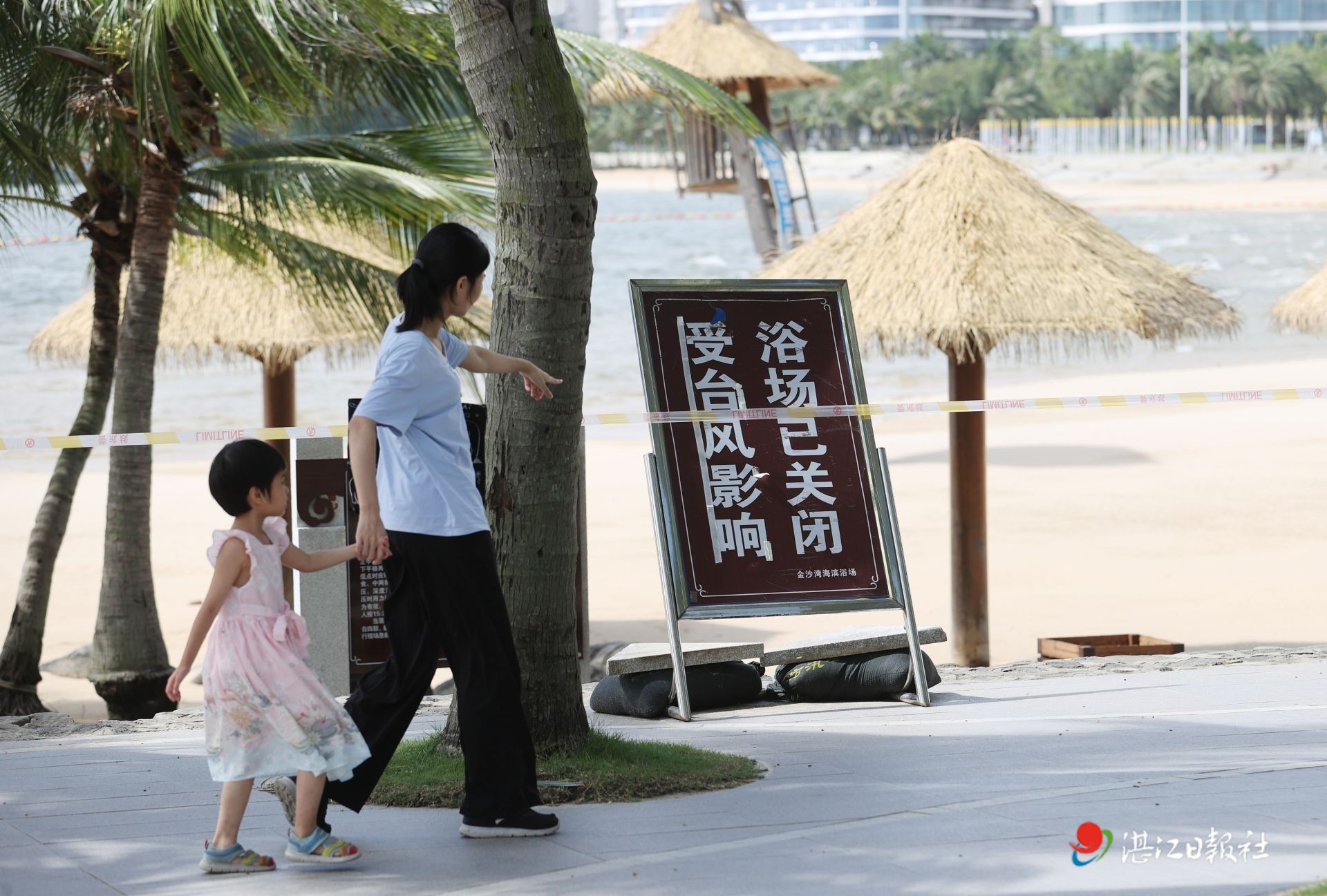 在赤坎區體育北路,公交站旁醒目的白天鵝造型塑像已被繩索仔細捆綁加固。金沙灣海濱浴場入口外圍,“受臺風影響,浴場已關閉”的提示牌已醒目擺放,靠近海邊的警戒線也拉上,提醒市民游客遠離危險區域,景區巡查人員用小喇叭喊話,勸離在海邊警戒線內的游客。同時,清潔人員正及時清理沙灘及周邊區域的垃圾雜物。