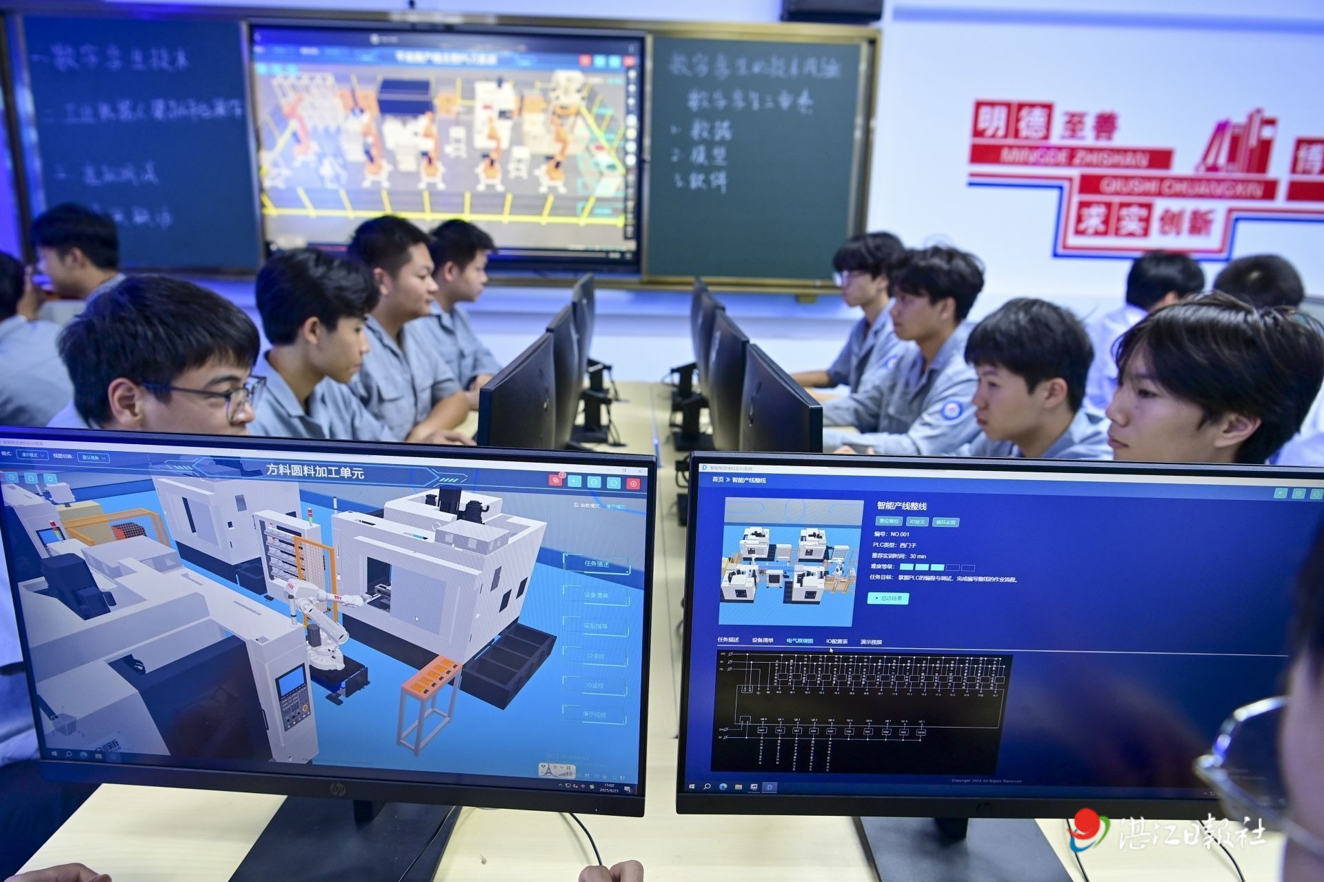 湛江市技師學(xué)院智能制造實(shí)訓(xùn)中心,學(xué)生們通過數(shù)字孿生技術(shù)掌握操作知識(shí)。記者張鋒鋒 攝