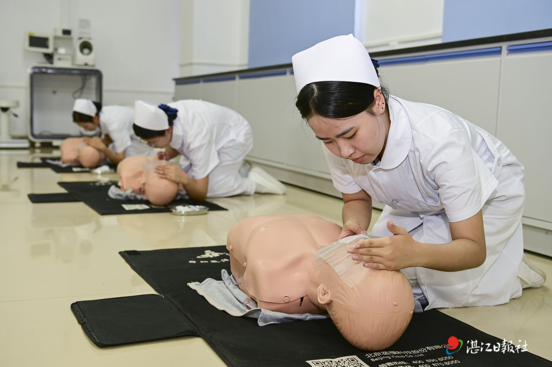 湛江衛(wèi)校,學(xué)生通過模擬訓(xùn)練掌握心肺復(fù)蘇技術(shù)。記者張鋒鋒 攝