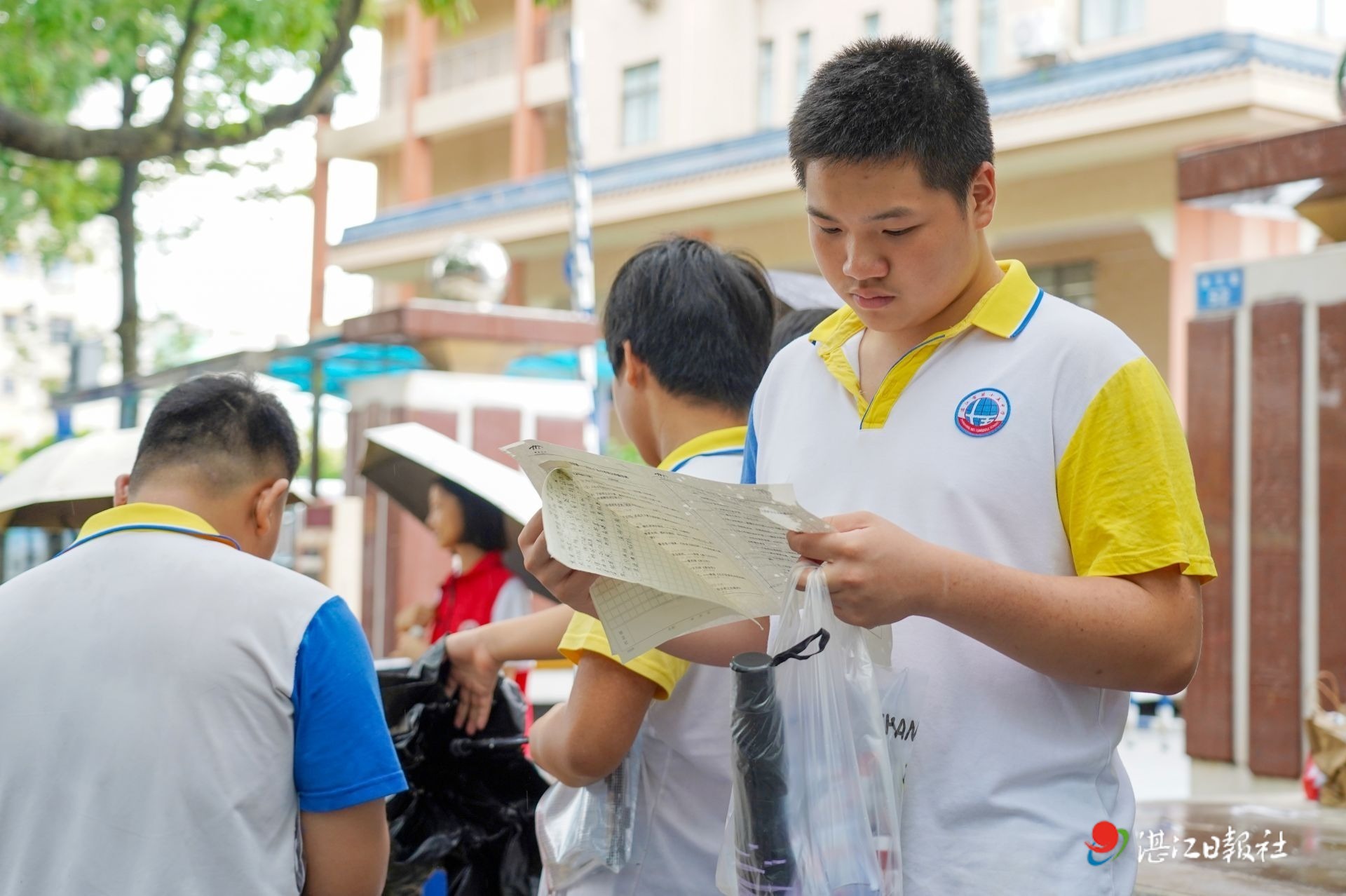 6月30日下午,湛江一中考點內,考生們冒雨準備進入考場。