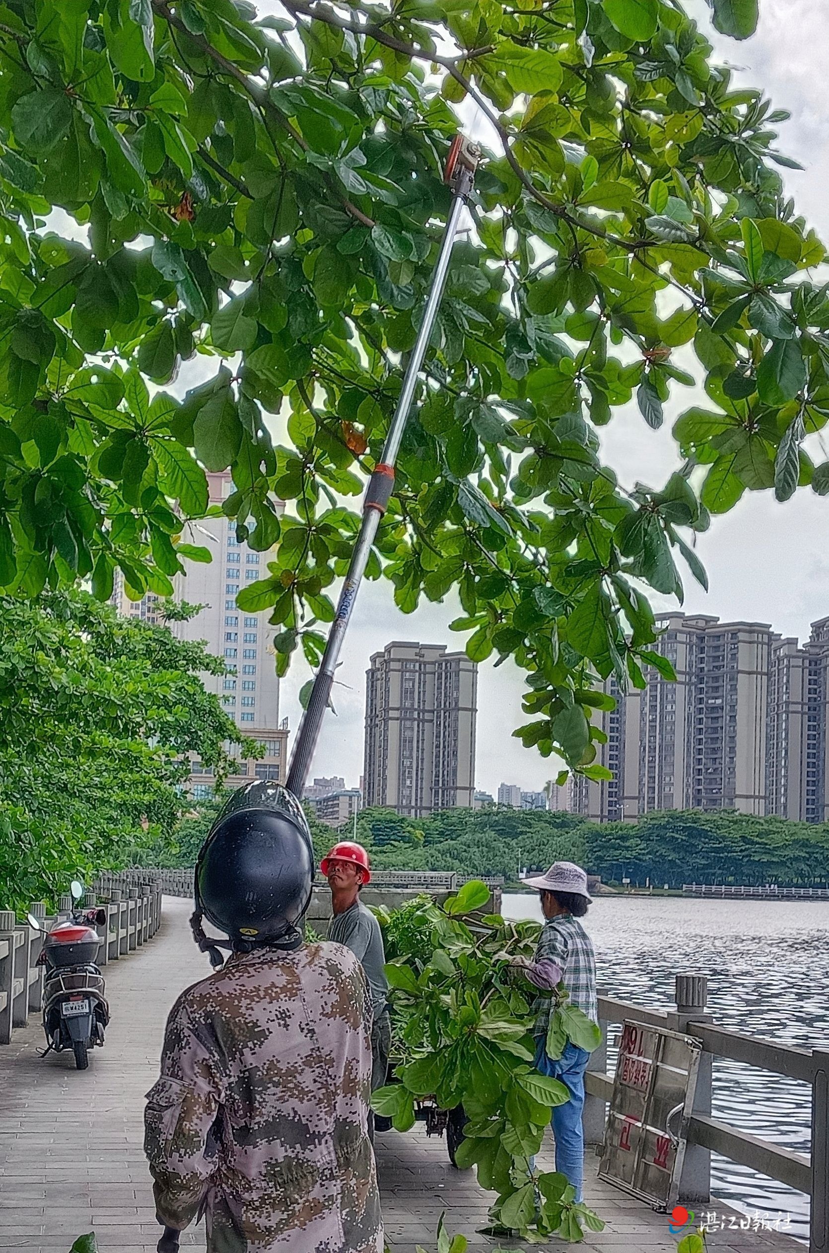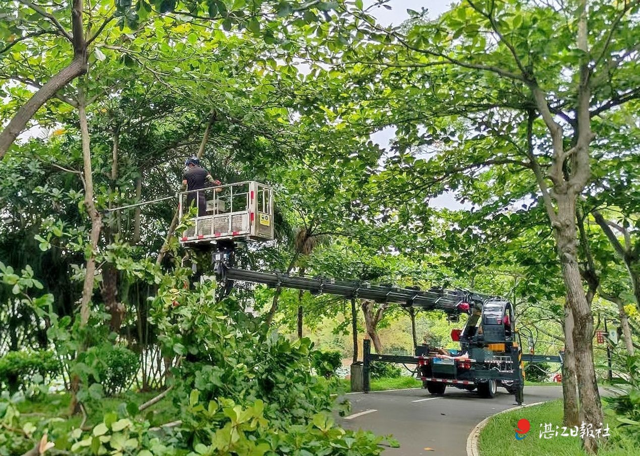 7月19日,在濱湖公園和南國熱帶花園,綠化工人們正忙碌著對公園內可能存在風險的樹木進行細致的修剪和加固工作,以防范臺風可能帶來的安全隱患。他們特別針對枯枝、病枝進行了提前修剪,以消除潛在的安全隱患。