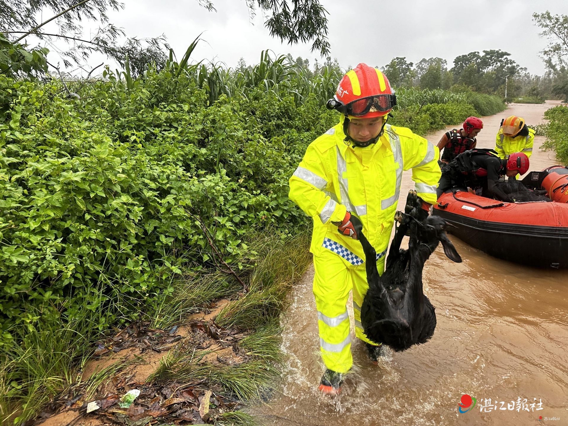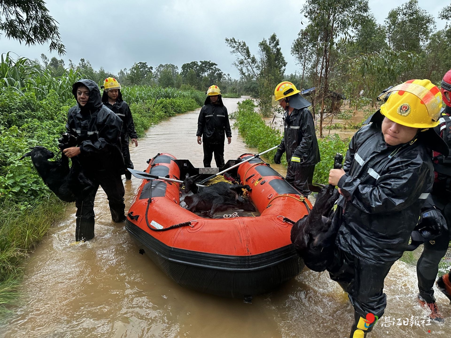 積水不斷上漲,已形成圍困羊舍之勢(shì),雷州西湖站消防隊(duì)員們劃著橡皮艇抵達(dá)羊舍,將黑山羊分批多次轉(zhuǎn)移。