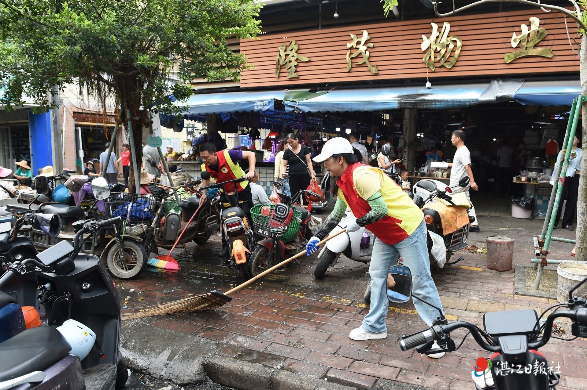 在農(nóng)貿(mào)市場周邊道清理積水。
