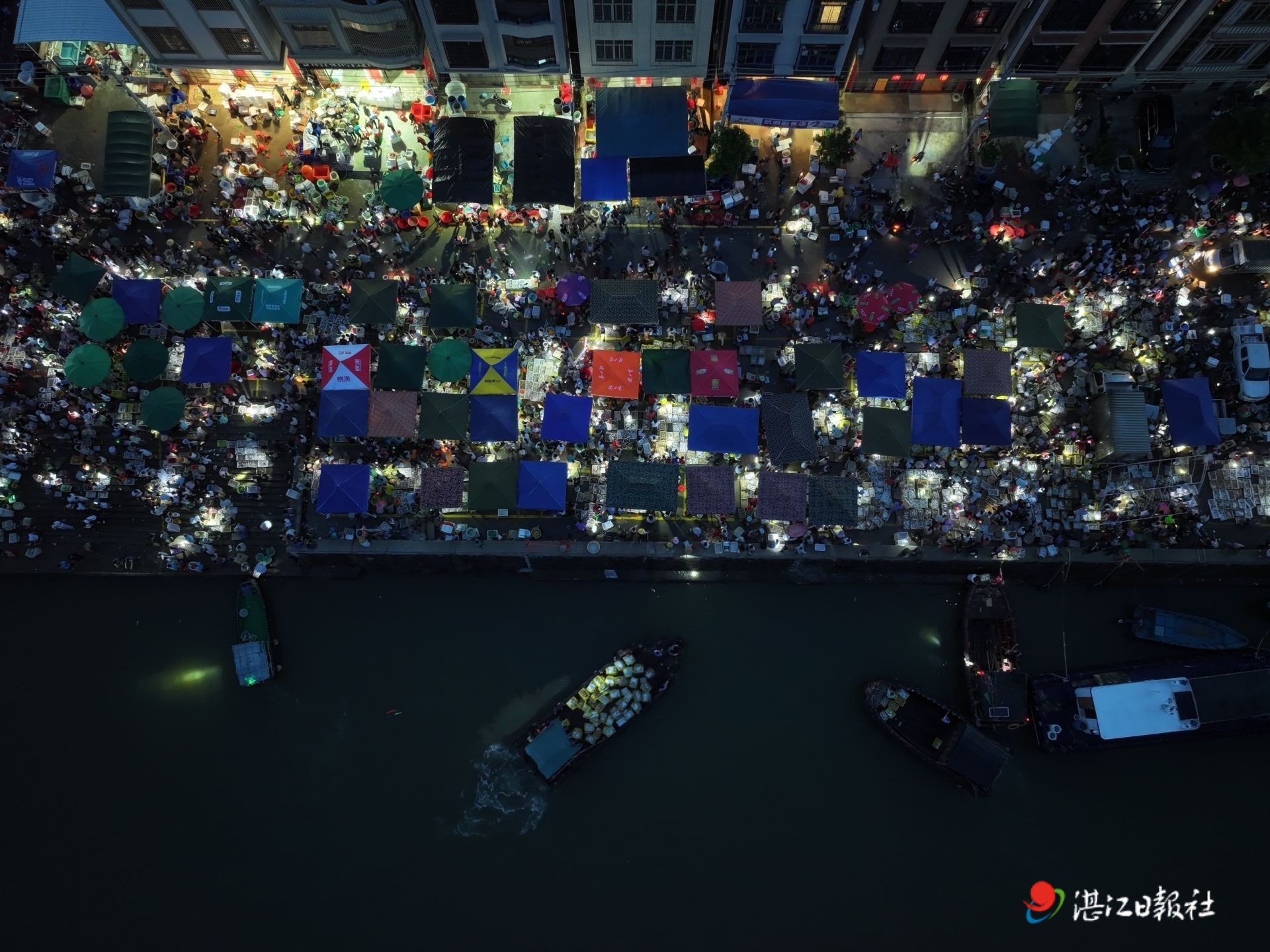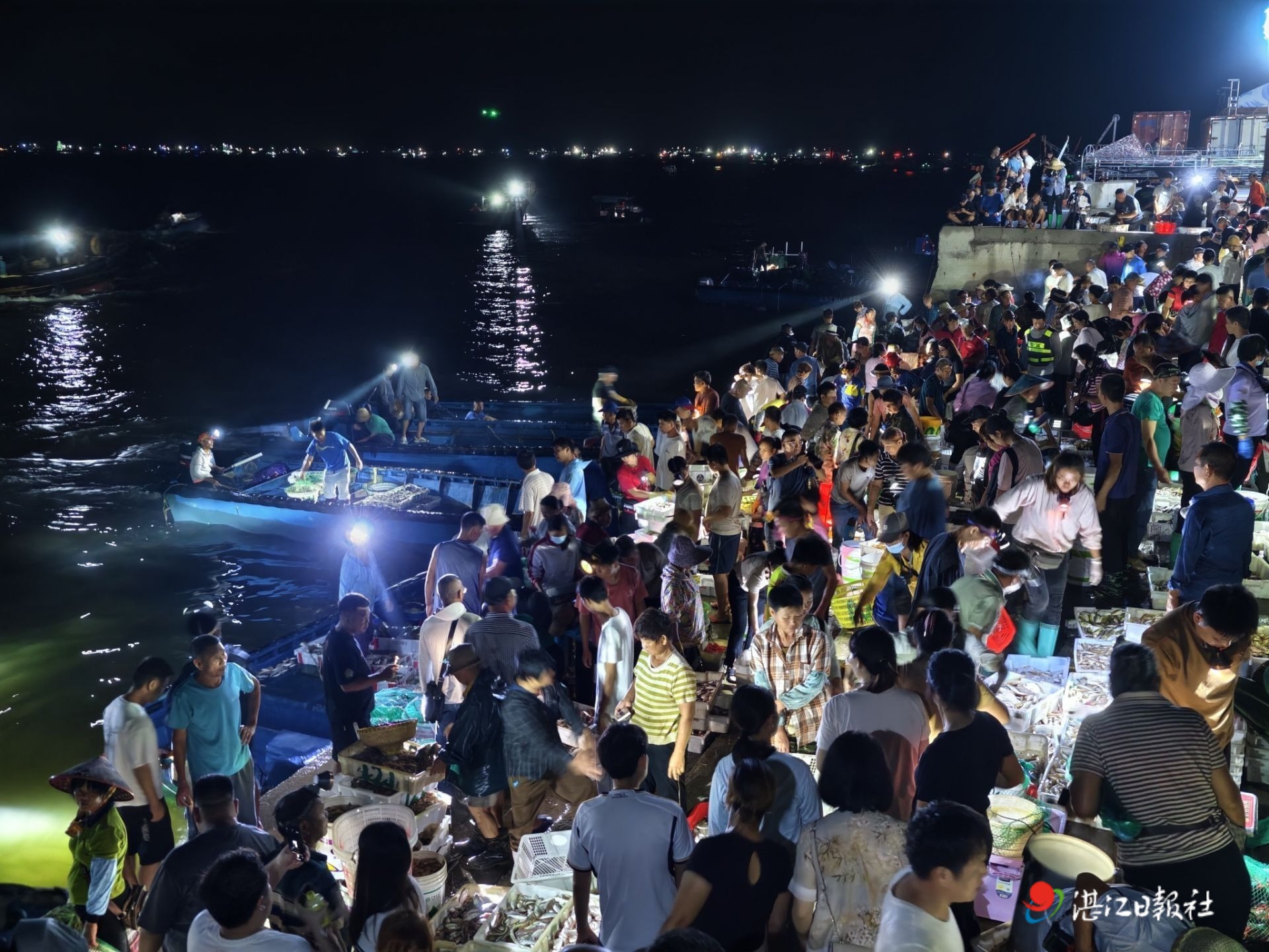 記者在現場看到,明蝦、南美白蝦、黑虎斑、黑鯛、魷魚、花蟹、梭子蟹等海產琳瑯滿目,整齊碼放,價格豐儉由人。碼頭上,“天光魚市”招牌明亮,漁民頭頂照燈忙碌招呼顧客,收購商與食客們則用手機手電筒打光挑選心儀海鮮。來自遂溪的陳小姐提著鼓鼓囊囊的海鮮袋笑意盈盈,她購置了魚、蝦等多種海產,打趣道“微信余額還充足得很”;麻章的左女士凌晨2點便驅車趕來,以35元一斤的價格買下26斤螃蟹分贈親友,直言“第一次來就趕上新鮮海貨,值了!”