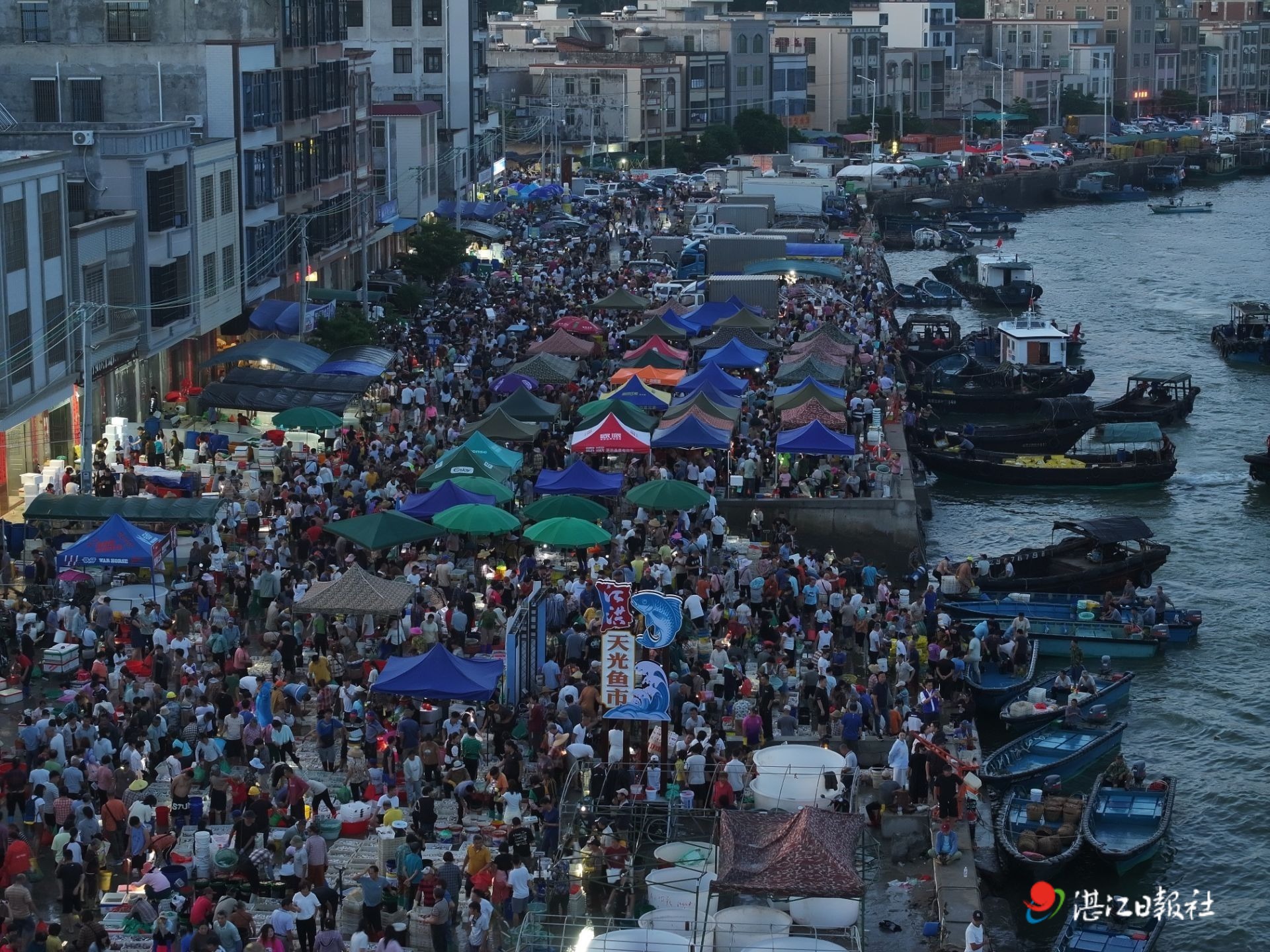 8月17日凌晨4時,遂溪江洪漁港碼頭馬達轟鳴,晨光中的漁船陸續歸港,甲板上銀光閃閃的漁獲堆成小山。碼頭上人頭攢動,貨車、摩托車穿梭不息,商販吆喝聲與顧客討價還價聲交織成曲,奏響開海后第一波豐收樂章。