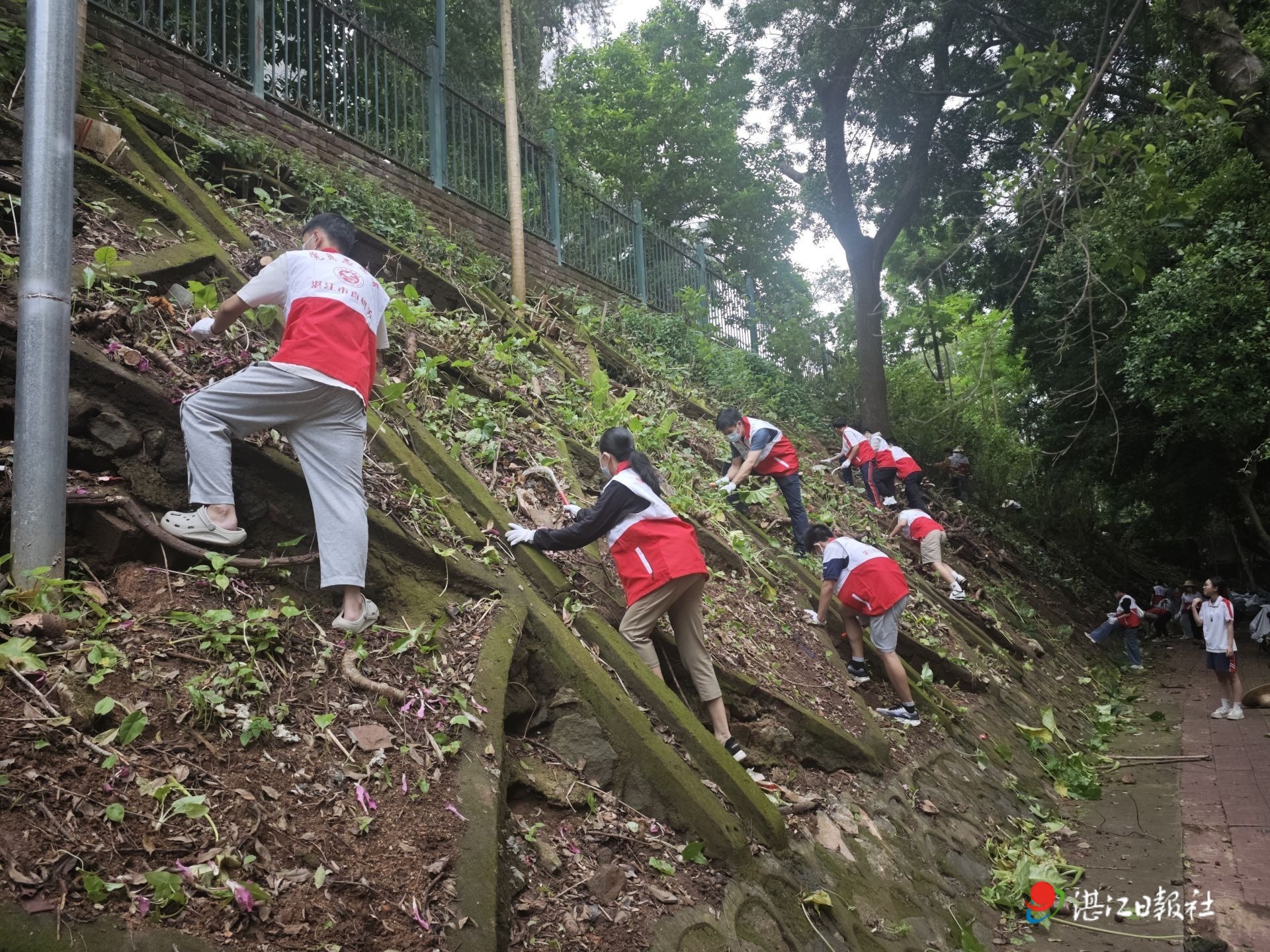 傍晚時分,放學鈴聲響起,嶺南師范學院門口的學生們沿著整潔的人行道走出校園,路邊的半坡地上,幾位穿著紅馬甲的志愿者正彎腰清理雜草。“以前這片坡地很多垃圾,一到夏天就臭烘烘的,我們都繞著走。”大三學生小林說,如今這里成了“小綠地”,偶爾還有居民來散步。