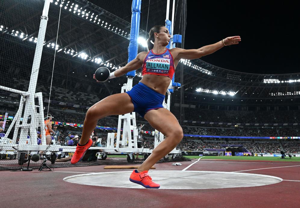 9月14日,美國選手奧爾曼在比賽中試投。最終,她獲得冠軍。新華社記者 宋彥樺 攝