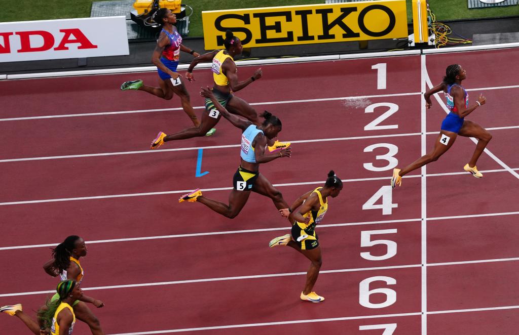 新華社東京9月14日電(記者吳俊寬、王子江)東京田徑世錦賽14日共產生6金,其中牙買加選手塞維爾在男子百米飛人大戰中稱雄,美國的奧運季軍杰弗遜-伍登則在女子百米決賽中以破賽會紀錄的成績折桂。