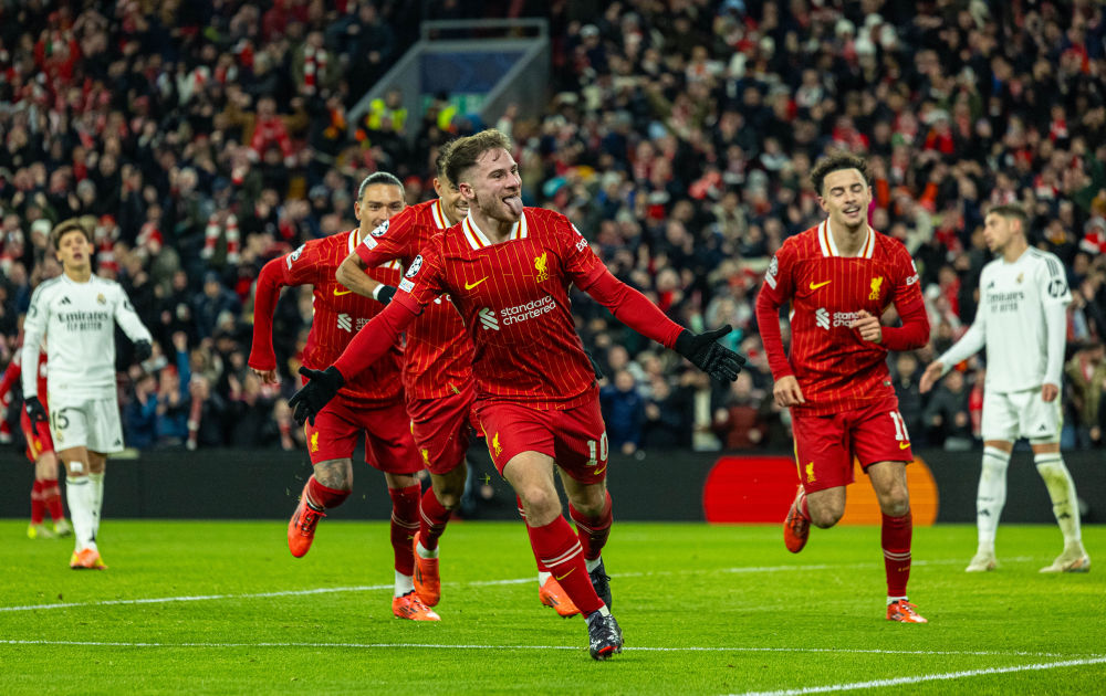 2024年11月27日,利物浦隊球員麥卡利斯特(前)在比賽中慶祝進球。當日,在2024-2025賽季歐冠聯賽階段第五輪比賽中,英超利物浦隊主場2比0戰勝西甲皇家馬德里隊。新華社發