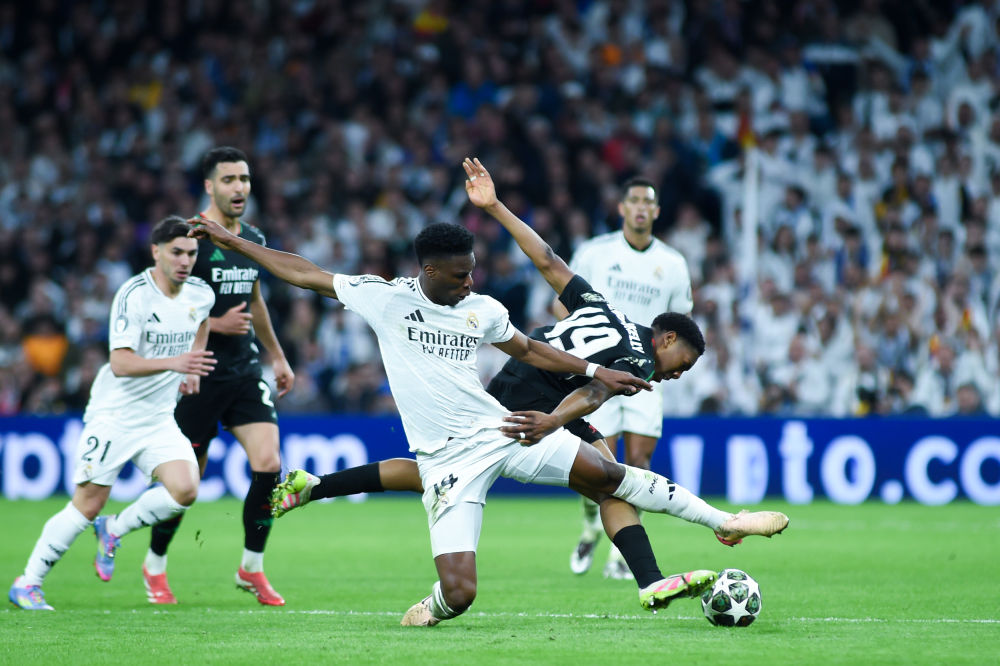4月16日,皇家馬德里隊球員楚阿梅尼(前左)與阿森納隊球員劉易斯·斯凱利在比賽中拼搶。當日,在西班牙馬德里舉行的2024-2025賽季歐洲足球冠軍聯賽四分之一決賽次回合比賽中,英超阿森納隊客場2比1戰勝西甲皇家馬德里隊,并以兩回合5比1的總比分晉級半決賽。新華社發(古斯塔沃·巴連特攝)