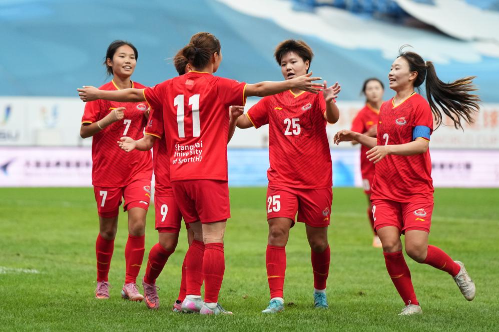 9月17日,上海體育大學(xué)女足球員慶祝進(jìn)球。新華社記者 鄭煥松 攝