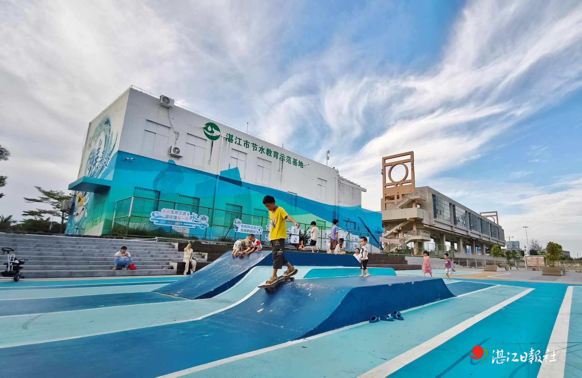 湛江金沙灣青少年運(yùn)動(dòng)場(chǎng)里,踩著滑板的孩子。 記者劉冀城 攝