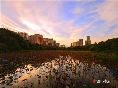 9月23日傍晚,臺風“樺加沙”來臨前,港城上空出現(xiàn)滿天的絢麗晚霞。在綠塘河濕地公園,大片云彩映照在上空,色彩艷麗。