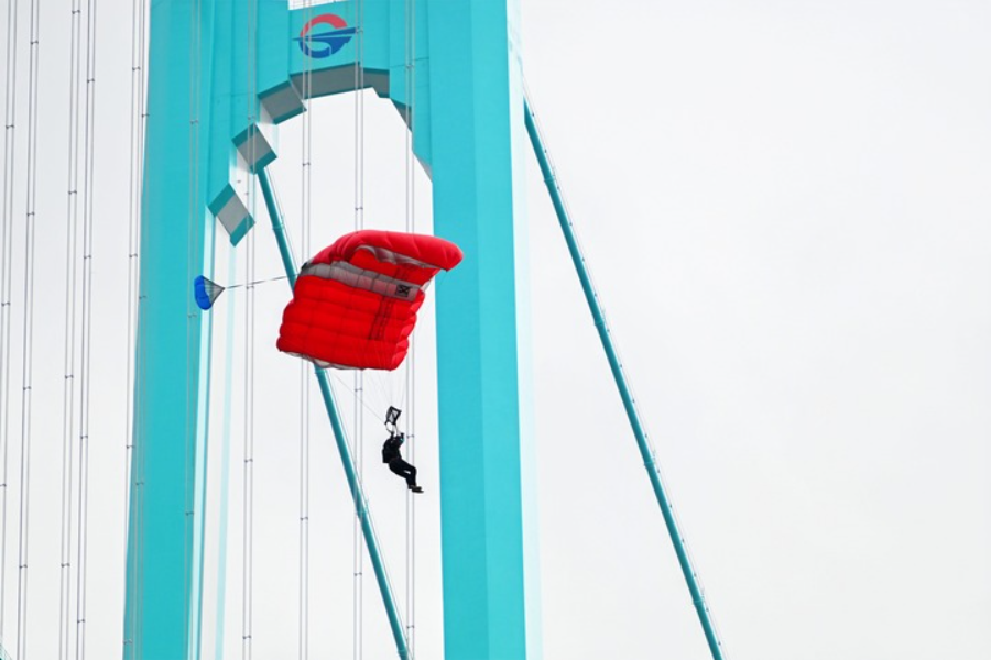 橋面上,荷蘭低空跳傘運動員、本屆賽事安全員卡姆正忙于最后籌備,監測風速、風向。這位擁有13年低空跳傘經驗的專家,同時身兼特技演員與賽事組織者,曾獲得荷蘭全國翼裝跳傘錦標賽季軍。盡管今年天公不作美,他表示“全球頂尖運動員皆以來到這里為榮”。