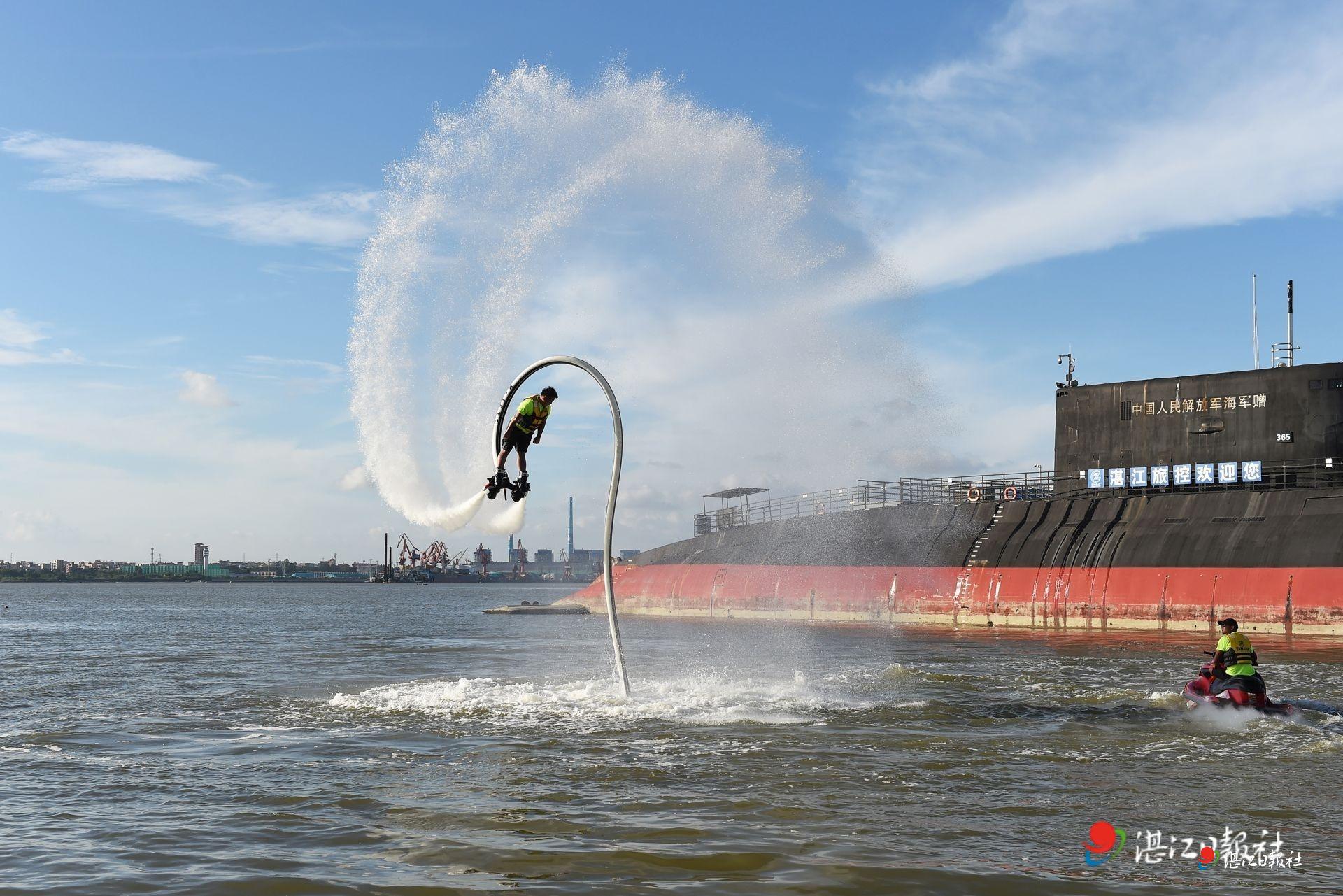 水上飛人表演區(qū)域不時(shí)傳來(lái)陣陣驚呼。表演者在高壓水流助推下騰空而起,完成旋轉(zhuǎn)、攀升等高難度動(dòng)作,仿佛海上鋼鐵俠,引得岸上觀眾紛紛舉起手機(jī)記錄精彩瞬間。