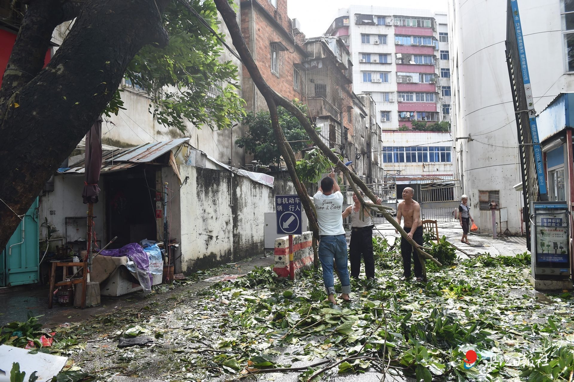 赤坎區環衛工人在中山一路清理路面樹枝樹葉。