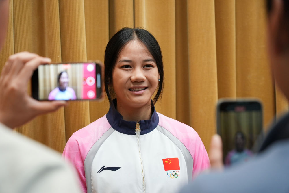 10月13日,田徑運動員張可依在大會后接受采訪。當日,第三屆亞洲青年運動會中國體育代表團成立動員大會在北京舉行,本屆運動會將于10月22日至31日在巴林舉辦。新華社記者 胡星宇 攝