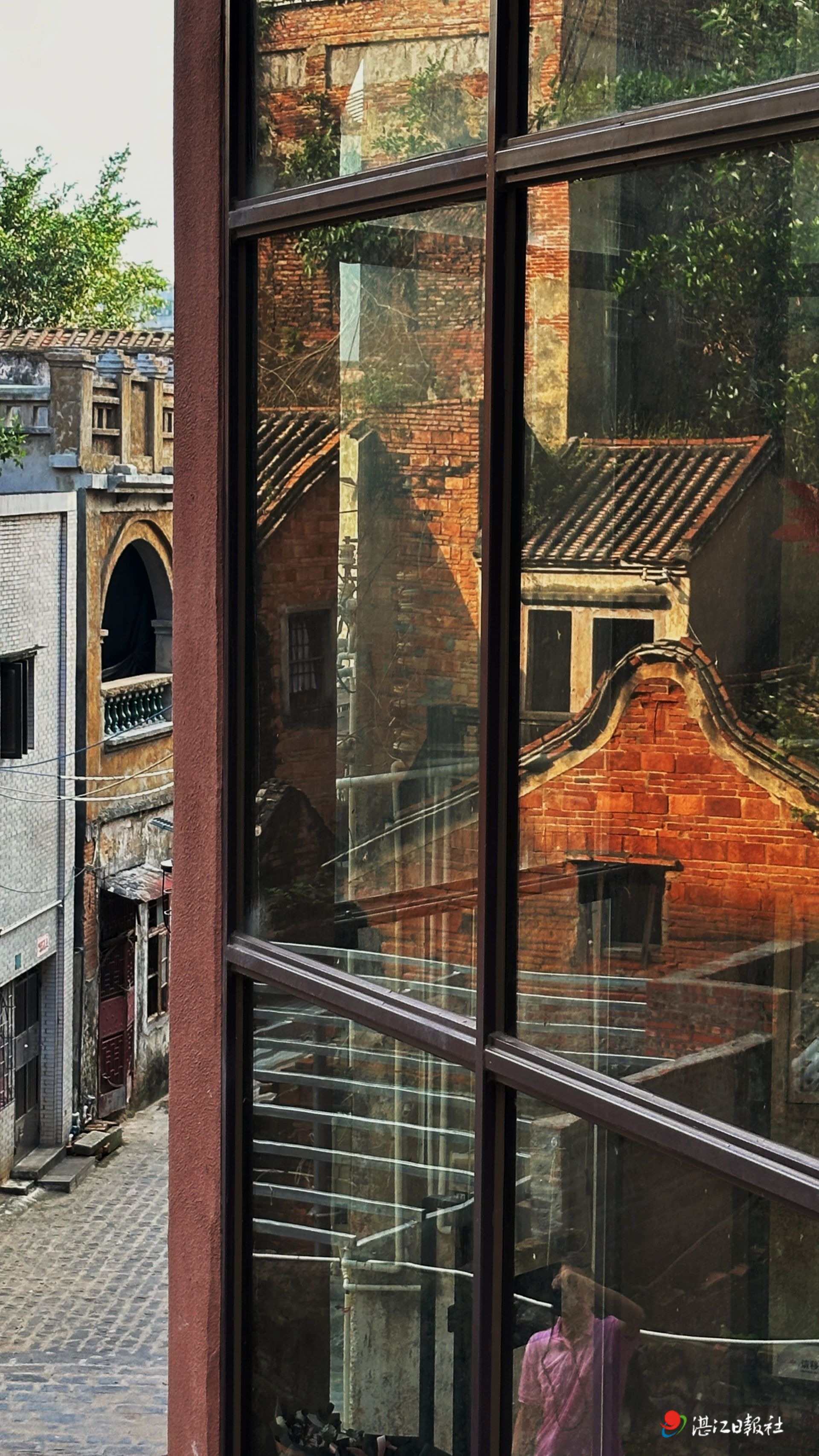 10月16日清晨,金色的晨光灑落在赤坎老街的青磚灰瓦間。古渡口七號碼頭旁,在暖陽映照下,老屋舍悄然“復刻”于一棟現代建筑的玻璃幕墻上。一位手持相機、尋覓光影的影友置身其中。傳統與現代在晨曦中交相輝映,于倒影與實景的疊合中,煥發出別樣的魅力。